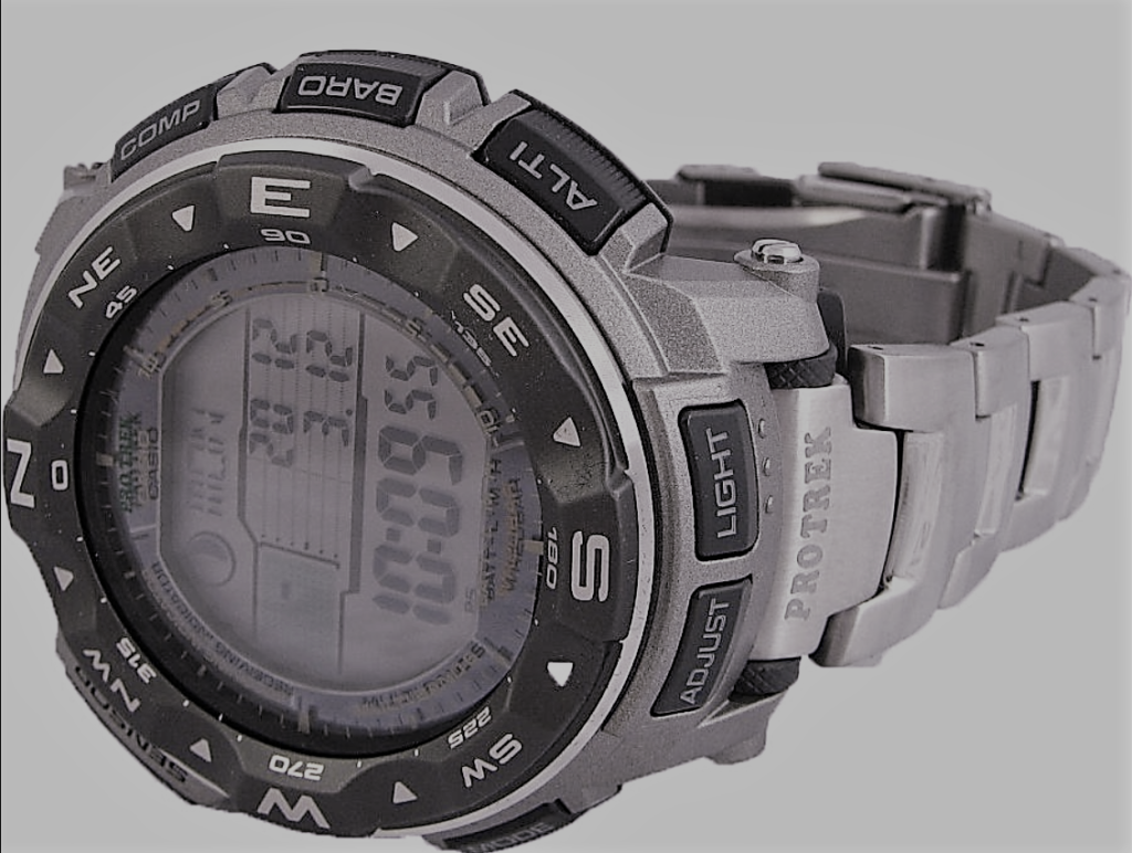 Данные цифровые часы обладают большим набором дополнительных функций, таких как термометр, компас, альтиметр, барометр. Кроме того с их помощью можно посмотреть и фазы луны. При таком большом наборе дополнительных функций, они способны работать даже в крайне тяжелых условиях без малейших ошибок. Часам не страшны удары, так как жидкокристаллический дисплей изготовлен ударопрочного материала, а благодаря калибровке с использованием радиосигнала, точность времени гарантирована до микросекунд.
