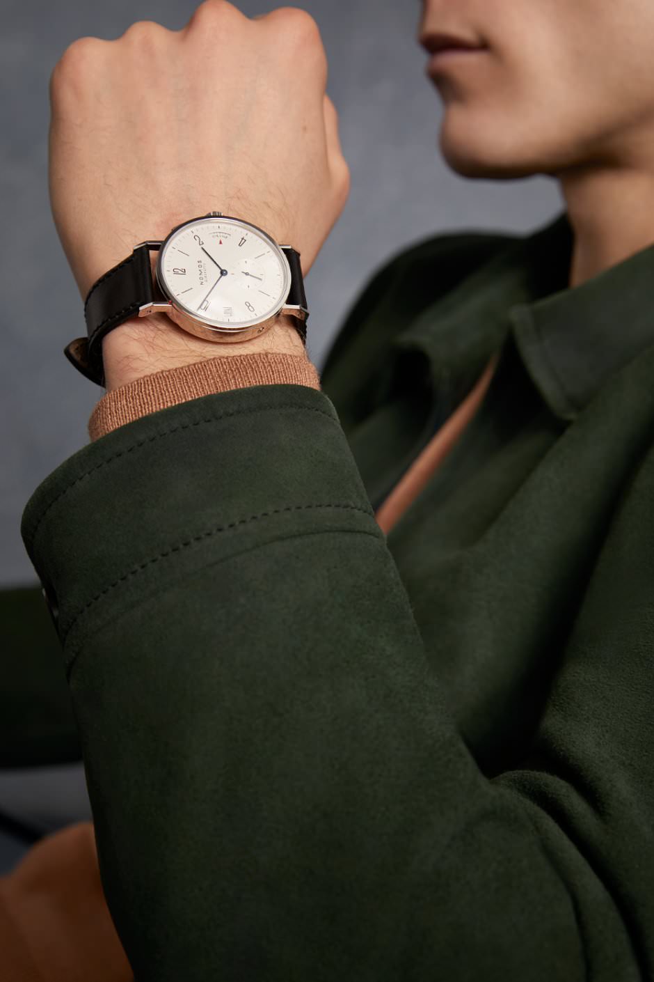 Как стиль smart casual соединяет в себе удобство стиля кэжуал и строгость классики, так и модель Nomos Glashütte, что на фото, объединяет в себе практичность и стилевую универсальность. Минимальная элегантность часов делает его универсальным повседневным изделием, которое будет работать с широким спектром одежды.