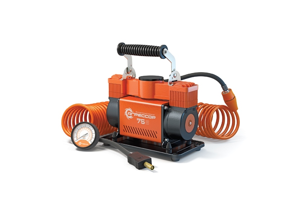 Литые из алюминиевого сплава корпуса камер сжатия снабжены ребрами, эффективно рассеивающими тепло. Оба воздухозаборника оснащены фильтрами. Прочная металлическая платформа на четырех резиновых ножках обеспечивает устойчивость при работе и изолирует прибор от грязи при размещении на неподготовленной поверхности. Воздушный шланг пружинный, переменной длины, оснащен быстрозажимным разъемом для состыковки с компрессором. Резьбовой штекер с манометром и клапаном дефлятора навинчивается на ниппель шины. Мощность автомобильного компрессора и потребляемая энергия достаточно высоки в сравнении с его скромными габаритами.