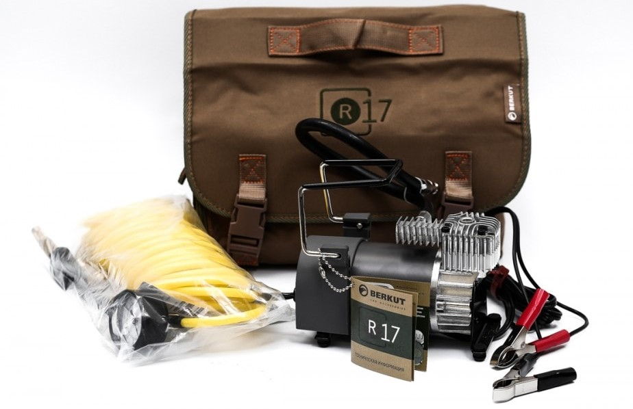 Компрессор питают от прикуривателя. Он может работать непрерывно около 30 минут. В него встроен стрелочный манометр. Кроме того, комплект оснащен дополнительными переходниками.