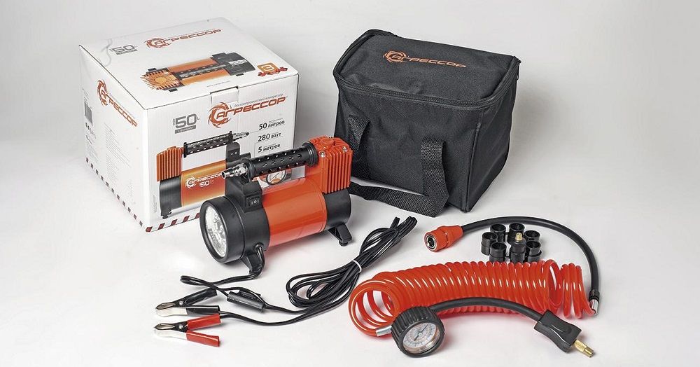 Агрессор AGR-50L – довольно недорогой автомобильный компрессор для накачивания покрышек с тщательно продуманными характеристиками. Его мощность весьма высока и составляет 280 Вт. Производительность устройства – 50 л/мин. Его можно применять не только для автомобилей, но и для велосипедов, резиновых лодок и других изделий. В комплекте имеются специальные насадки для этого. Насос продаётся с фонарём, манометром и сумкой. Стоимость – от 3000 до 4500 рублей, в зависимости от места приобретения.
