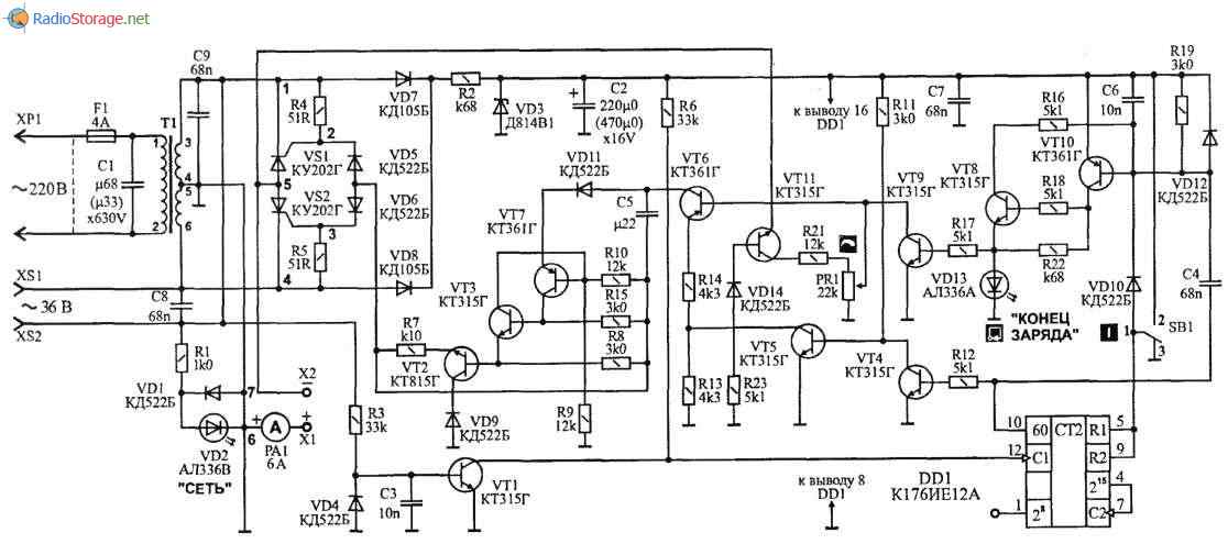 Выпрямленное напряжение подается на аккумуляторную батарею через контакты X1 («плюс») и Х2 («минус»). Для контроля величины тока заряда служит индикатор тока РА1.