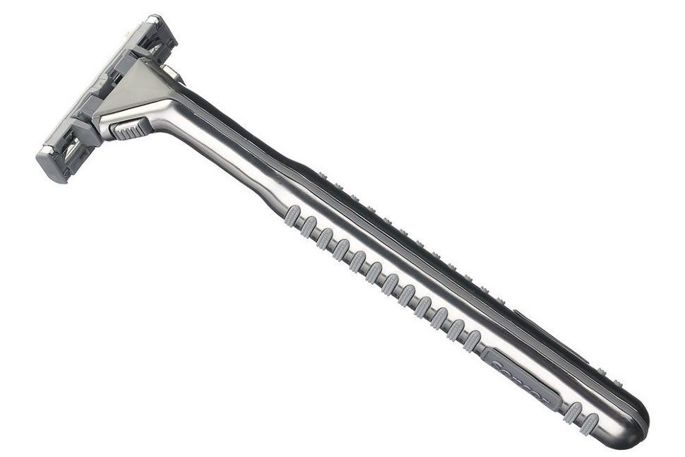 Еще одна многоразовая модель на основе картриджей. В состав бритвы входит 2 ножа-бритвы, прочная негнущаяся ручка и полоска с приятным запахом на основе антиксиодантов. Плюсы – хорошее качество бритья, небольшой риск возникновения раздражения, наличие защитной полоски. Минусы – не слишком высокое качество заточки и негнущаяся ручка, что делает бритье менее комфортным. Цена – 500-800 рублей.