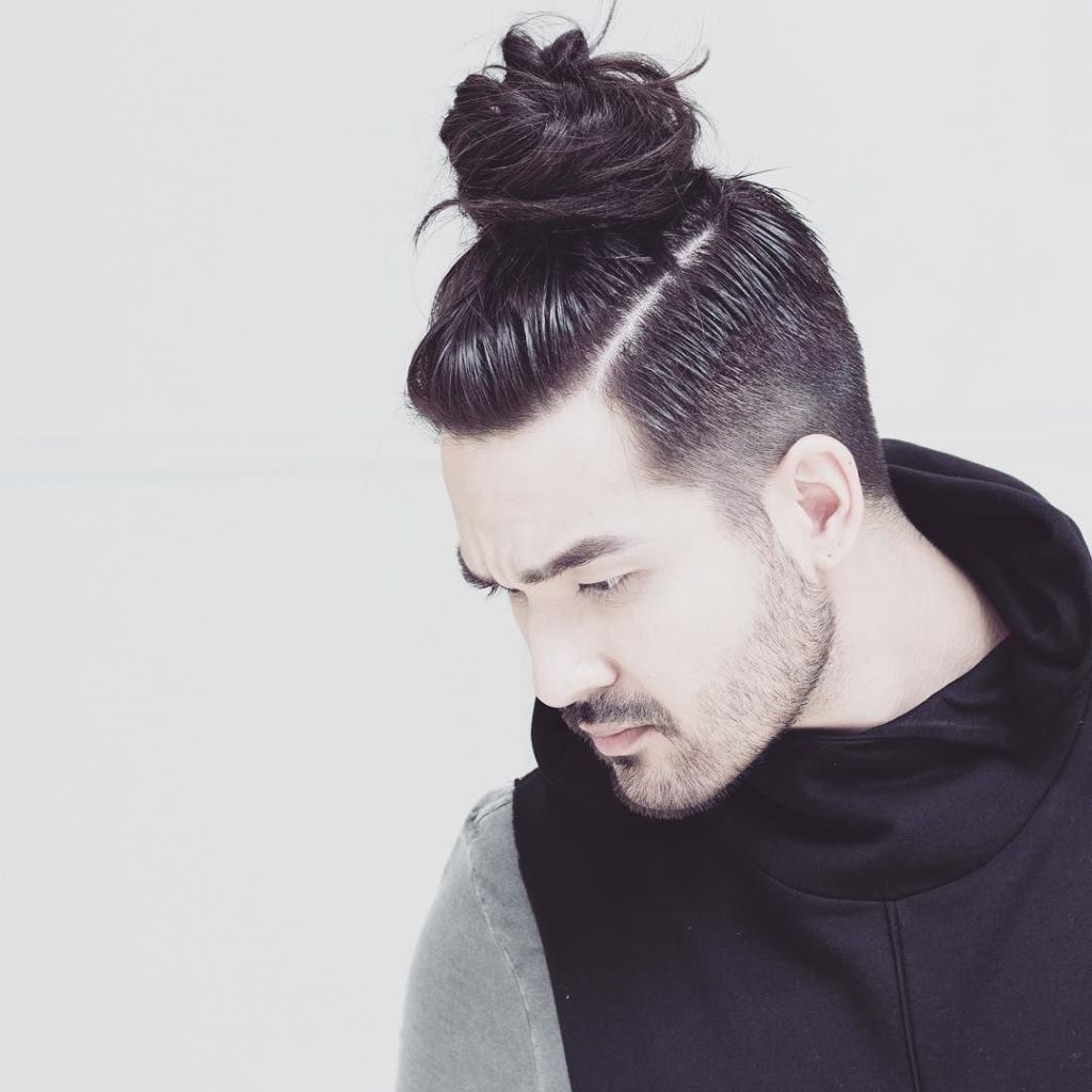 Прическа только для тех, кто сможет часто ухаживать за волосами, так как длинные волосы требуют особого ухода. Волосы собираются и завязываются на макушке в пучок. Возможен вариант с выбритыми висками и затылком.
