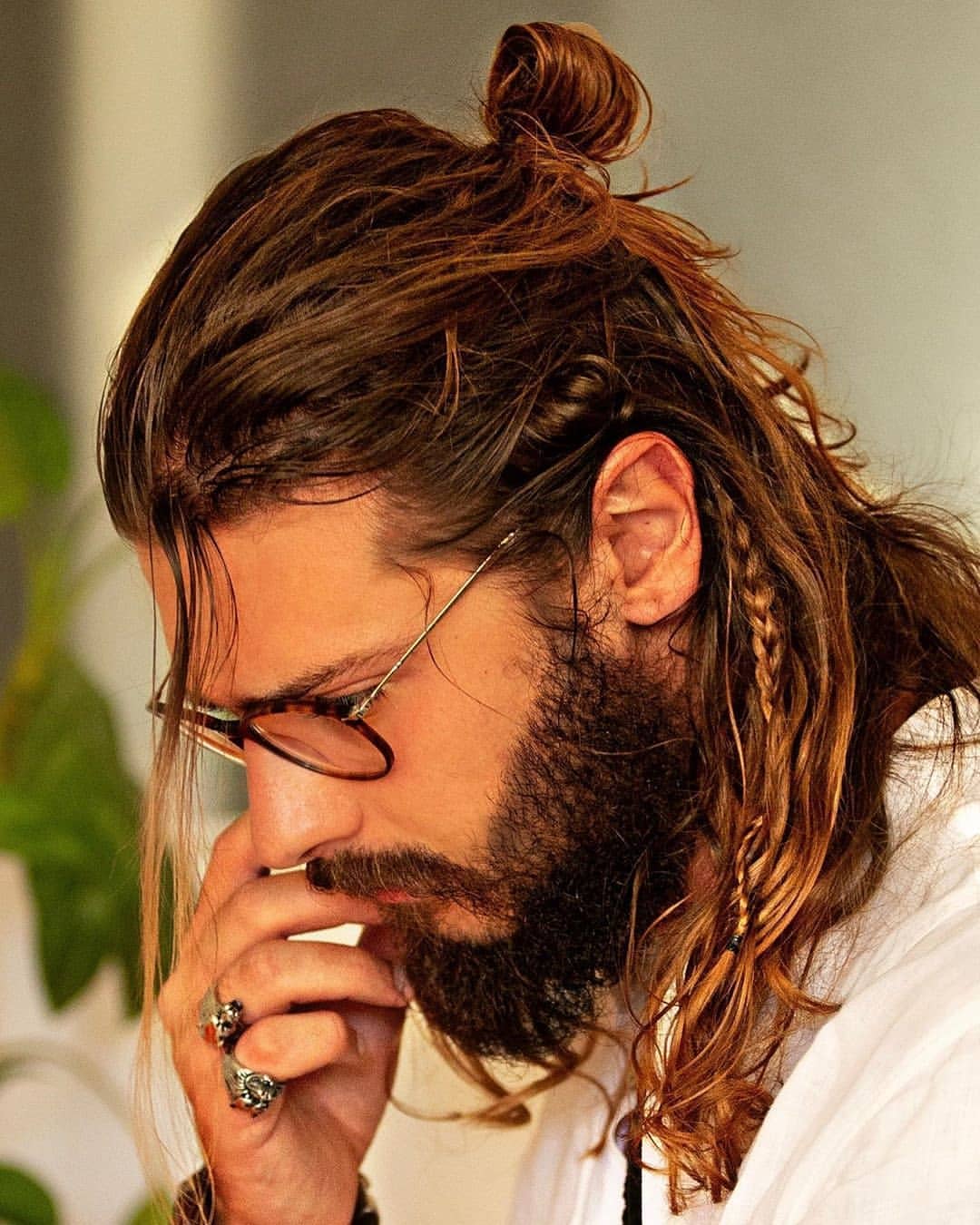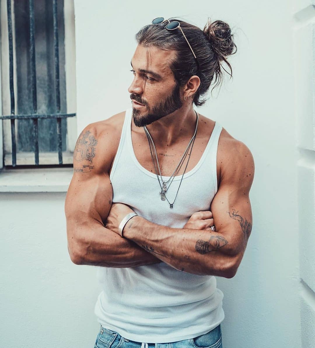 Классический пучок на базе удлиненной мужской стрижки в 2022 будут носить не только молодые художники и неформалы, но и солидные мужчины в возрасте. Такая прическа, с одной стороны, отлично подчеркивает индивидуальный стиль, а с другой – абсолютно не мешает даже во время занятий спортом.