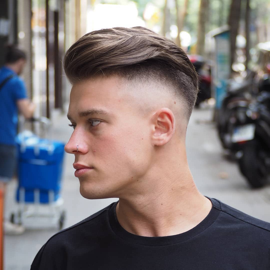 Характерные особенности канадки состоят в коротком затылке, наличии невидимых переходов и объемной макушке. Можно даже сформировать длинную челку. Если мужчина обладает правильными и выразительными чертами лица, он может выбрить виски и оставить на затылке совсем короткие пряди.