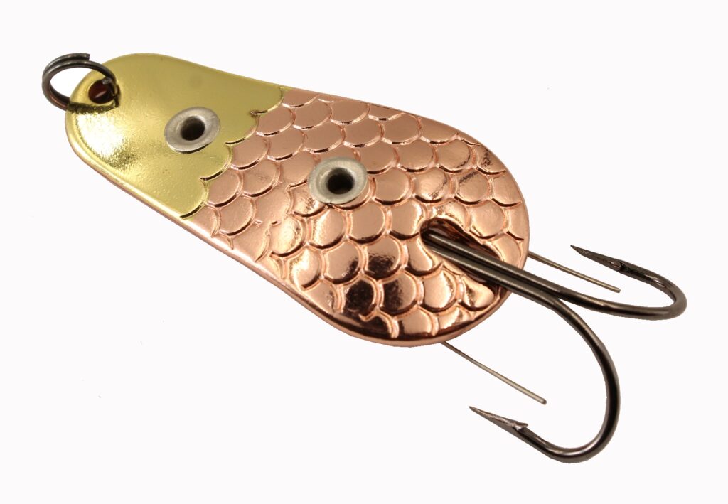- Из медной либо латунной заготовки можно вырезать пластину, напоминающую собой уклейку. Придать ей форму удастся благодаря чеканке или выдавливанию. После этого одну сторону обрабатывают и шлифуют, а вторую покрывают припоем, что утяжеляет блесну и помогает закрепить крючки.