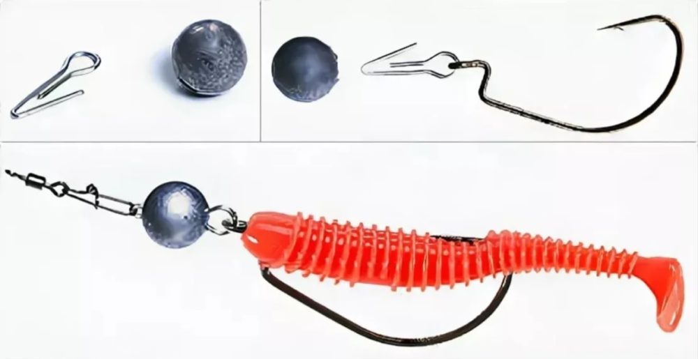 1. К центральному заводному кольцу крепятся шнур, силиконовая приманка на офсетном крючке и грузило на вертлюге.