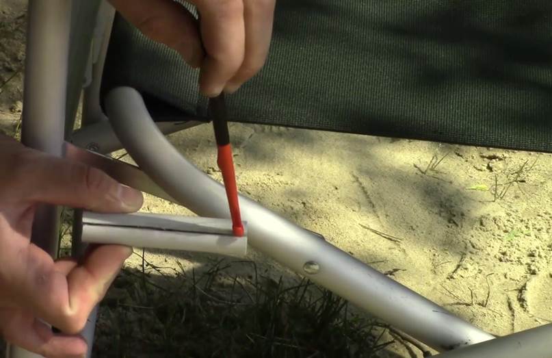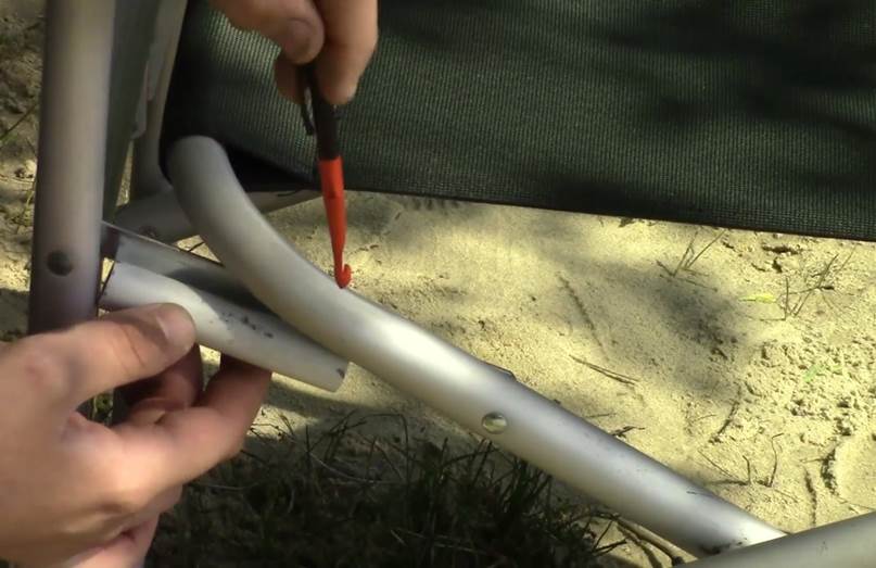 Точно также поступаем с остальными тремя направляющими. После того, как надеты все четыре металлопластиковых трубы (две спереди, две сзади), раскладываем стул и видим, что алюминиевый каркас полностью ложится на пластиковые трубы. Это однозначно защитит каркас стула от перетирания об сталь.