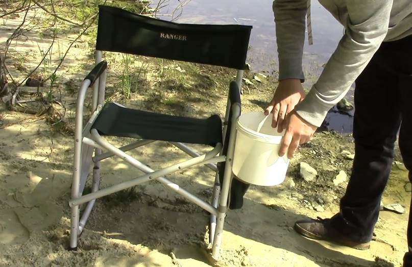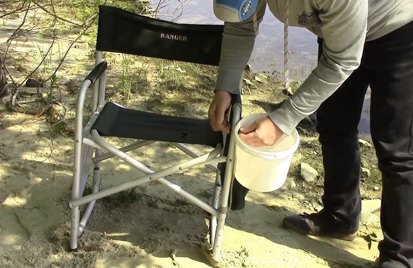 Поэтому рассмотрим, как емкость для прикормки приспособить к такому креслу. В качестве ёмкости для прикормки мы будем использовать пятилитровое ведро из-под краски. Крепить мы его будем на боковом каркасе.
