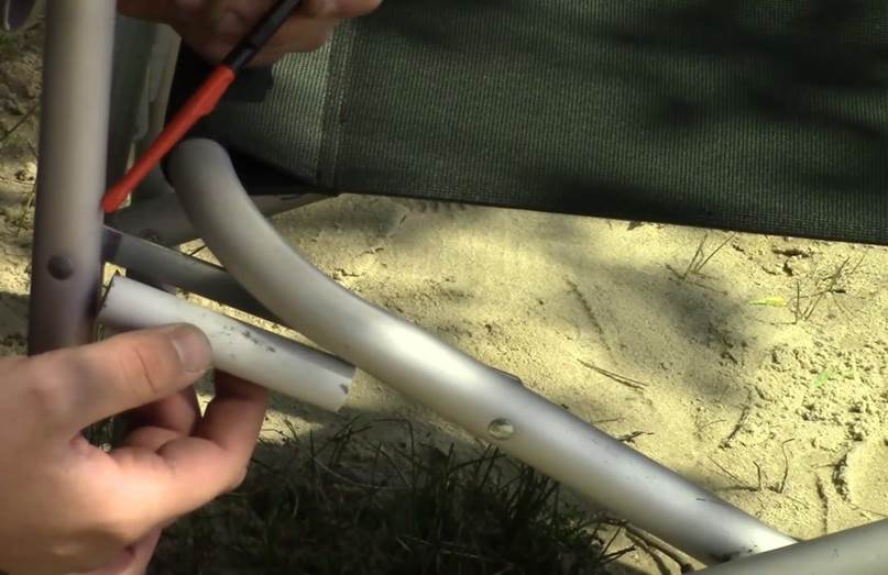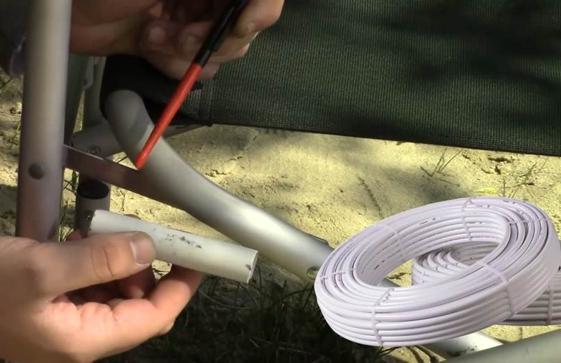 И получается, что во время эксплуатации алюминий очень быстро перетирается об сталь, труба лопается, и кресло приходит в негодность. На самом деле эта проблема решается очень просто. Для этого нам нужно четыре отрезка металлопластиковых водопроводных труб.