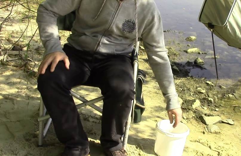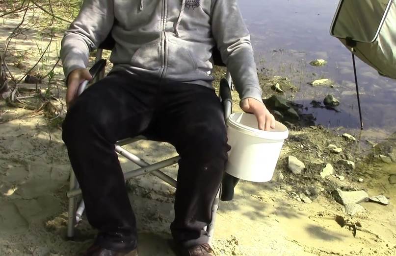 Вначале нам необходимо ведро выставить таким образом, чтобы во время рыбалки нам оно не мешало, то есть, чтобы в него не упирались ноги и в тоже время, чтобы ведро всегда было у нас под рукой.