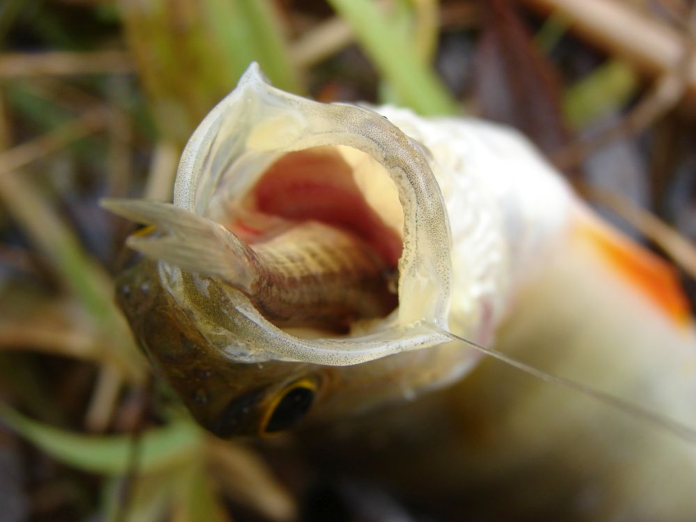 Поклевка у окуня выразительная. Поплавок или ныряет под воду или, чуть присев, начинает уходить в сторону. Медлить с подсечкой не стоит, поскольку перед полосатым суетится малёк – его естественная кормовая база, поэтому он не будет его обкусывать-обсасывать, как, например, червя, а, скорее всего, одним броском постарается его съесть (фото 5). Нередко бывает так, что, промахнувшись, окунь просто сбивает наживку с крючка, так что запас малька должен быть значительный.