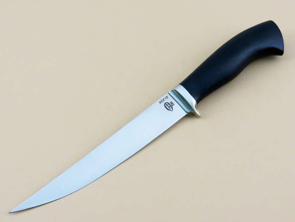 - Филейный. Его ещё называют филейником. У него довольно длинный и гибкий клинок, которым удобно филетировать рыбу и мясо. Клинок имеет размеры от десяти до тридцати четырёх сантиметров. Стандартный размер — от пятнадцати до девятнадцати сантиметров. Клинок обычно изготавливают из нержавеющей стали.
