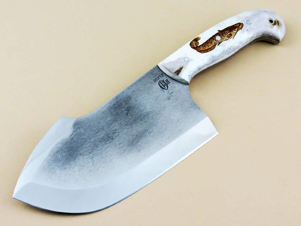 - Разделочный. Имеет короткий клинок, чем-то напоминающий маленький топор. Клинком такой формы удобно разделывать рыбу и мясо. Очень ценится рыбаками и охотниками ввиду своей универсальности: можно и ветки строгать, и тушу разделывать.