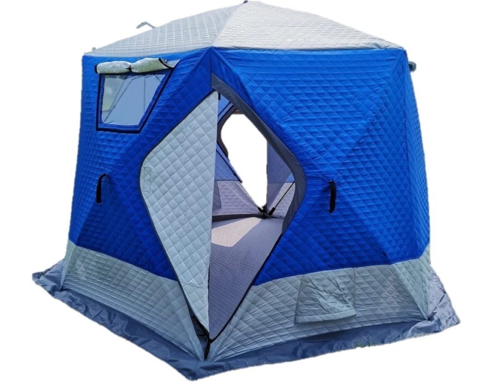 В палатке для зимней рыбалки (куб двухслойный) предусмотрен внутренний тент, утепляющий защитное укрытие. Изделия с 2 слоями выполняются из качественного водоотталкивающего сырья. Конструкция снабжается вентиляционными отверстиями для поддержания микроклимата в помещении. Изделия используются при температуре от -25°С.