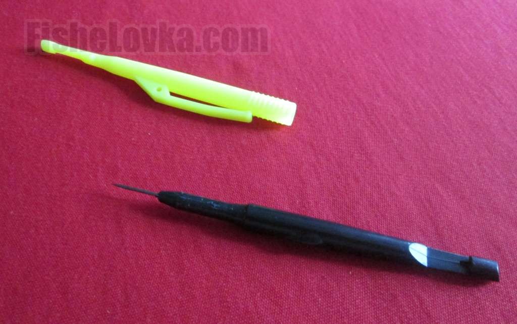 На одной части закреплен механизм для соединения лески с крючком. На другой две иголки разной длины (2), что применяются при создании петли на леске.