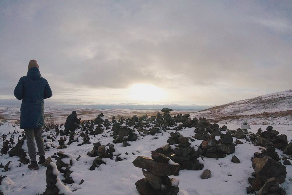 Целое поле, где кто-то выложил невысокие пирамидки из камней — гурии. И все это на фоне солнца, заходящего за горизонт, — мимо таких пейзажей просто так не проедешь
