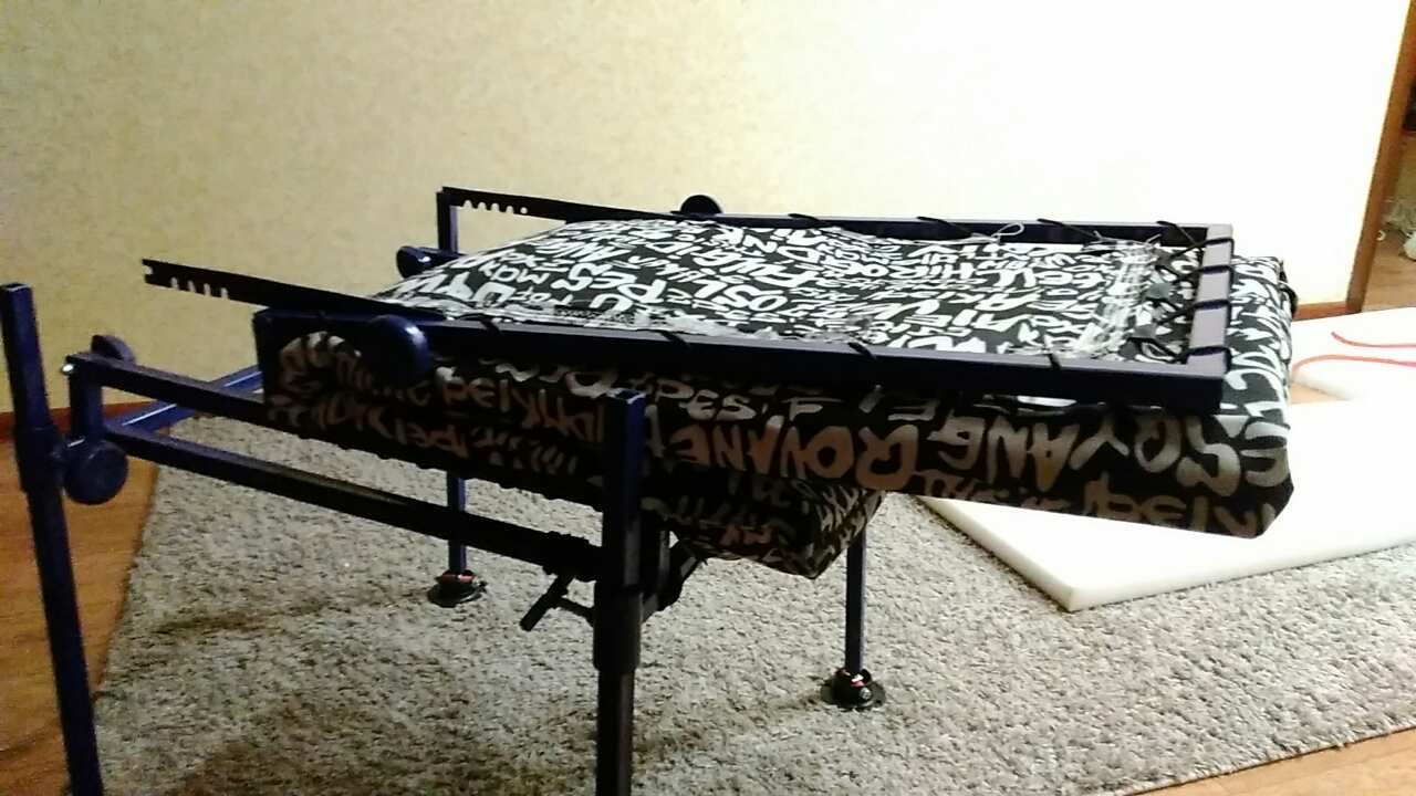 - Производится обтяжка тканью. На каждой короткой стороне создаются отверстия, через которые протягивается резинка, за счет которой материал закрепится на каркасе. На длинных сторонах ткани для сиденья делаются такие же крепежные отверстия, а при помощи резинок они привязываются к металлу.