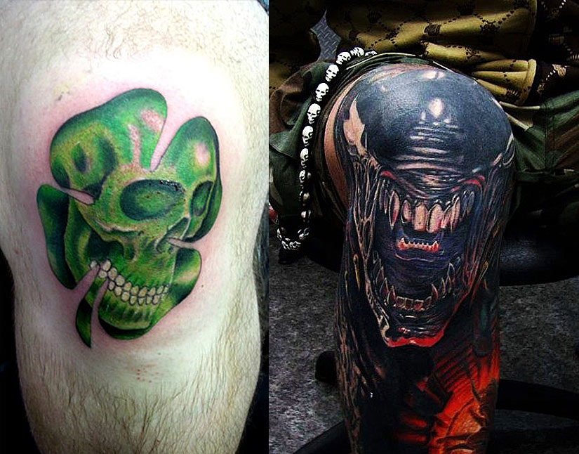 Интересные татуировки на колене в виде клевера с черепом и морды чужого