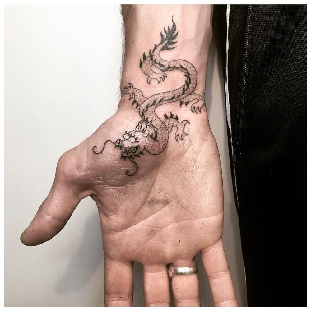 Одним из самых популярных фантастических героев считается дракон. Многие мужчины выбирают его для татуировки на запястье. Татуировка дракона символизирует величие, гордость и непобедимость мужчины.