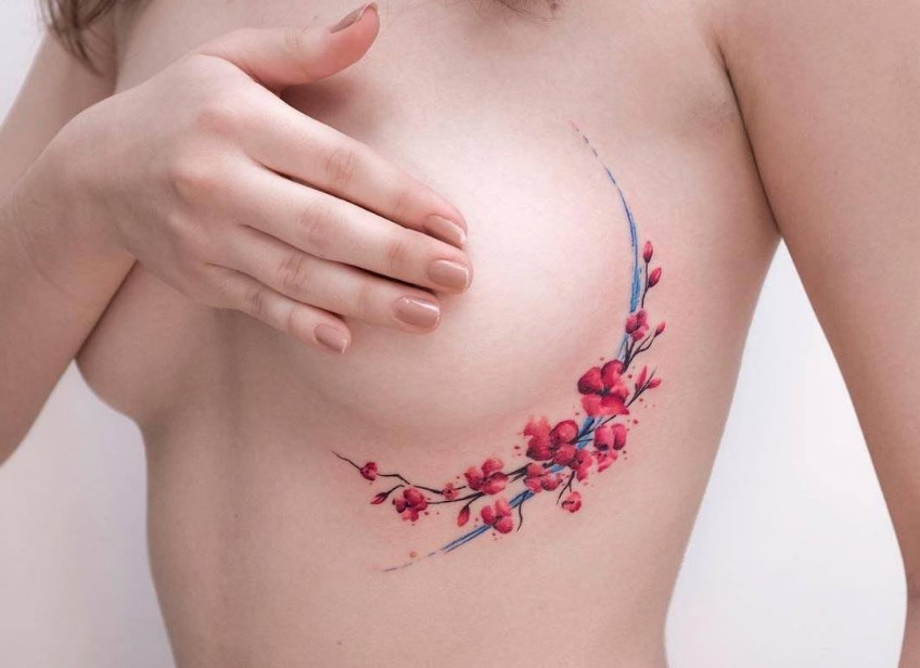 Выбор на тату под грудью часто падает из-за желания скрыть какие-то дефекты, например, шрам после операции по увеличению груди. Отличным вариантом станет эскиз с изображением цветов и различных веточек. Также довольно часто женщины набивают под грудью тату-надпись.