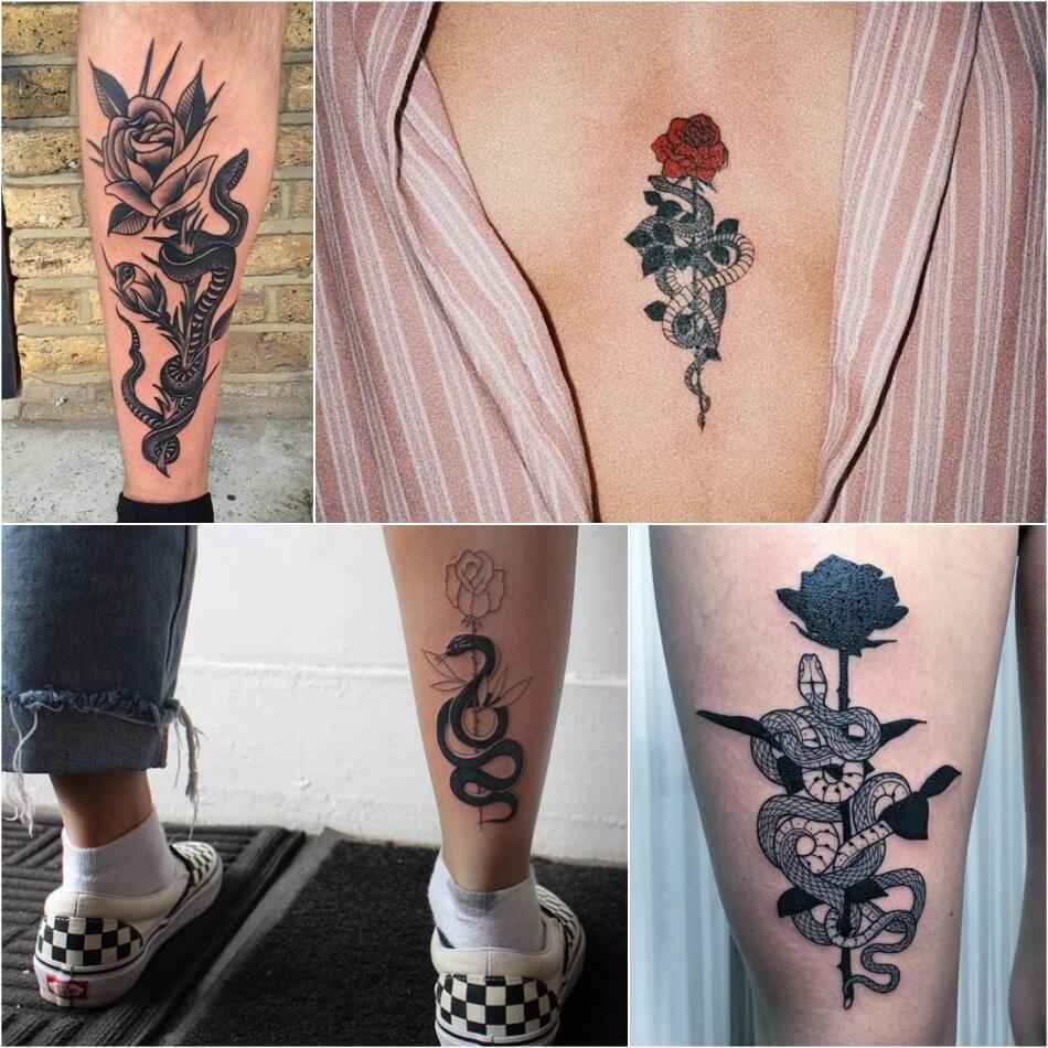 Змея с розой воспринимается как символ искушения. Змея сама по себе – символ пошлости и страсти, расположение с розой лишь усиливает это значение. Как правило, такие эскизы тату можно видеть у девушек, желающих намекать на соответствие характера этому символу.