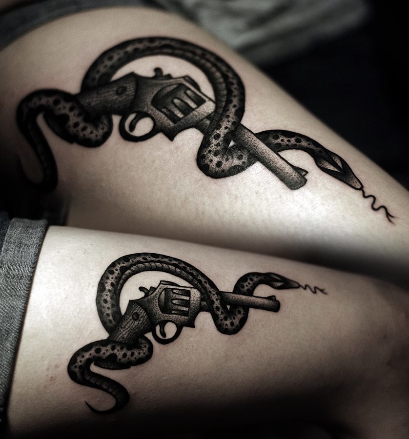 Змея, которая извивается вокруг плеча или предплечья выглядит очень изящно. Такое тату может подчеркнуть как красоту и элегантность женской руки, так и силу мужской руки. Символ змеи не имеет гендерной принадлежности, он может быть близок по значению и мужчинам и девушкам.