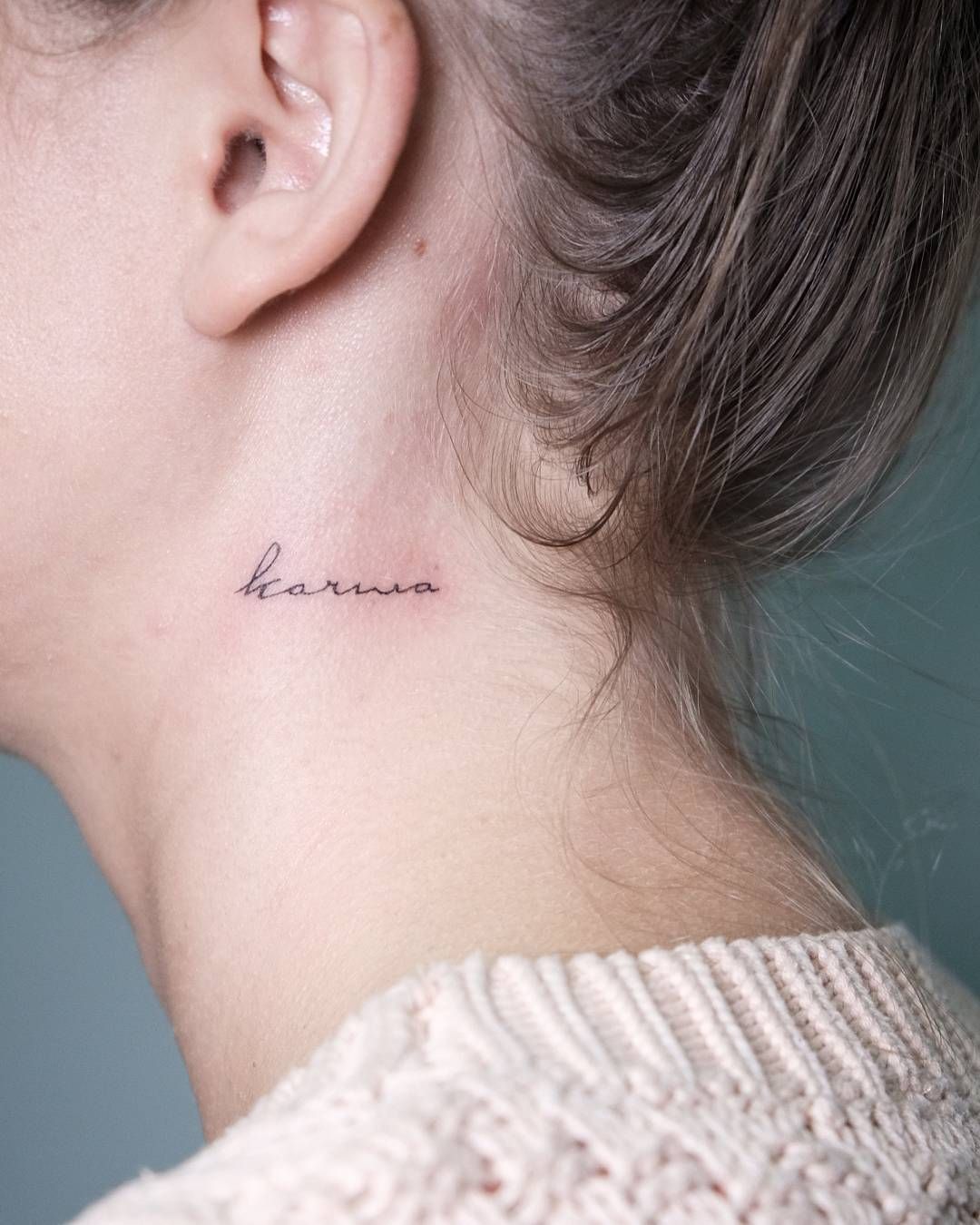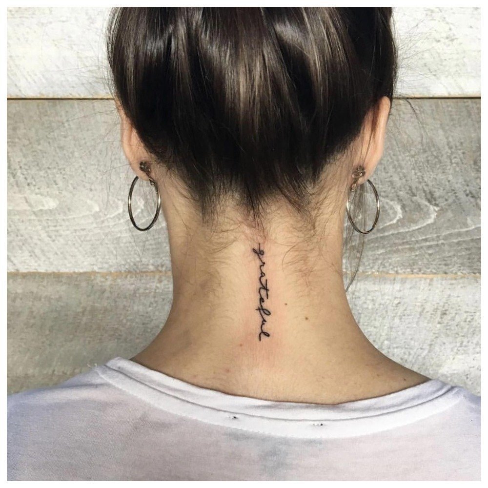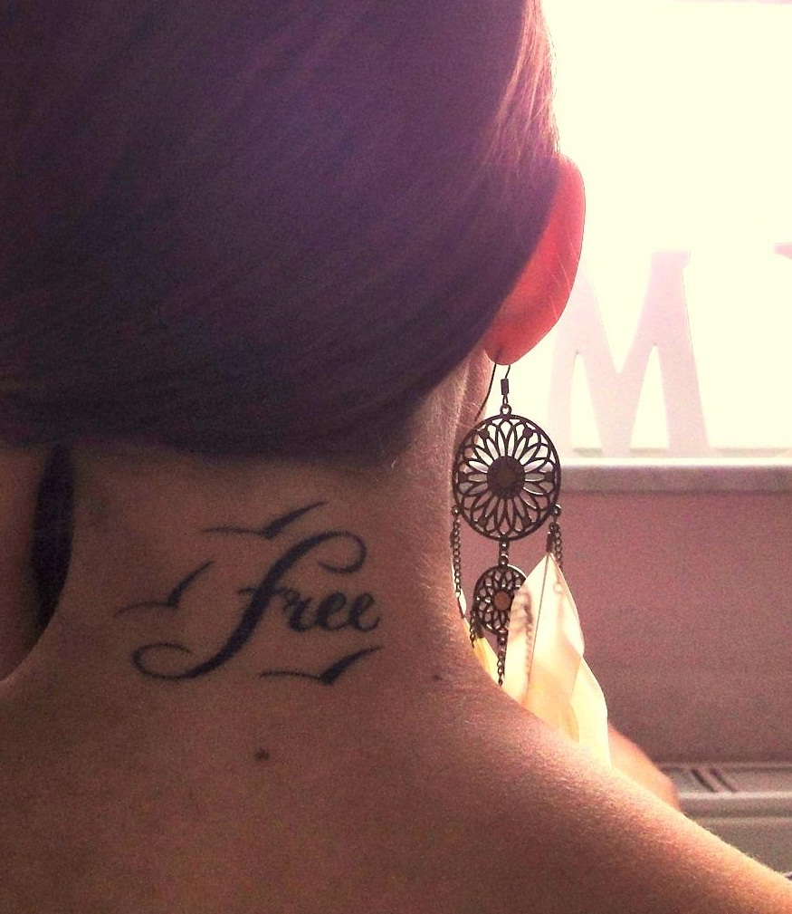 Шея – очень чувствительная зона. Набивать тату будет больно. Это открытая часть тела, поэтому потребуется постоянный уход за рисунком. Девушки обычно в этом месте набивают надписи маленького размера.