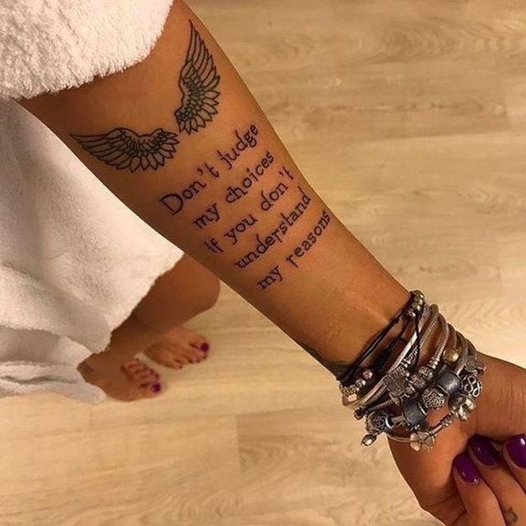 Для девушек, которые хотят показать свою оригинальность, тату на предплечье – лучший выбор. Большой плюс этой области – слабая боль при нанесении. Надписи со смыслом здесь будут смотреться четко и читабельно.