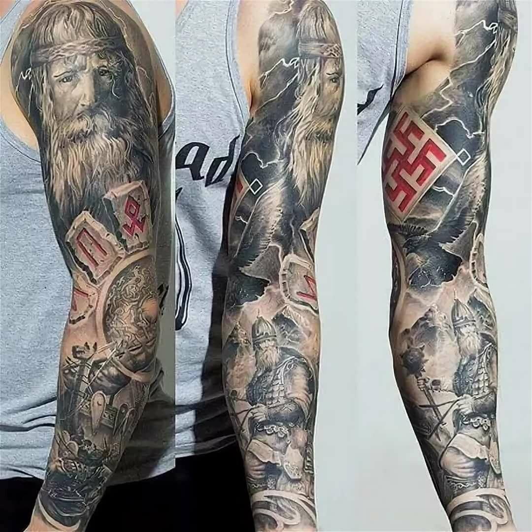 Если рассматривать рукав для мужчин в славянском стиле, такая татуировка будет показателем мужественности, уверенности в себе и целеустремленности.