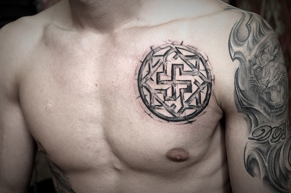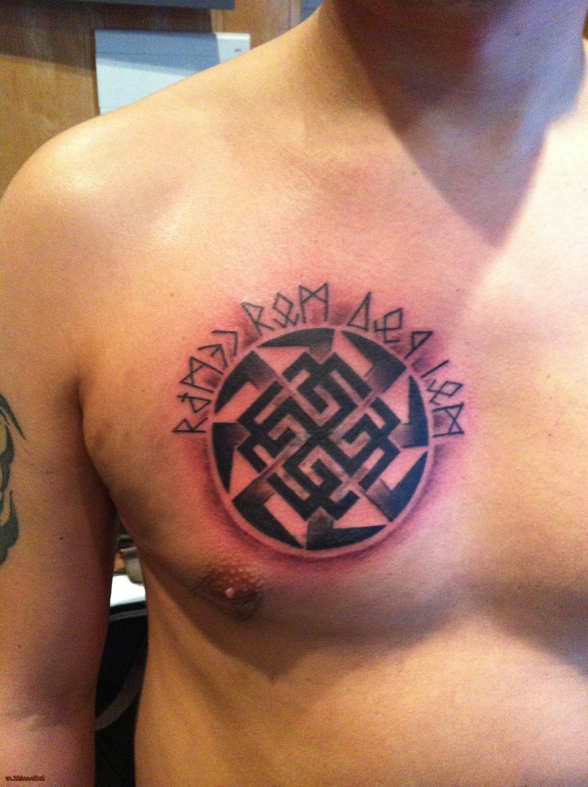 Татуировки на груди в старославянском стиле необходимы тем мужчинам, чья жизнь подвергается рискам. Доспехи, разные божества, символы, части природы помогут укрепить дух, силу, защитят от неприятностей и ошибок.