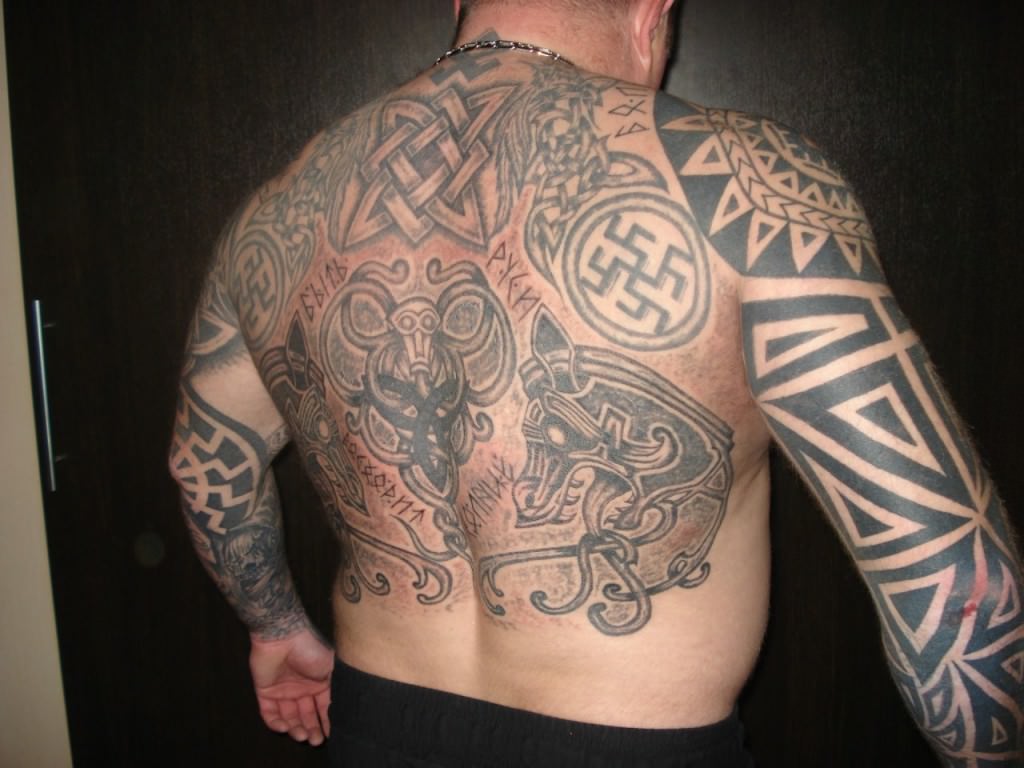 На лопатках чаще всего изображают символы, вроде коловрата или рун. Основной смысл таких тату – уравновешивание светлой и темной стороны внутри человека.