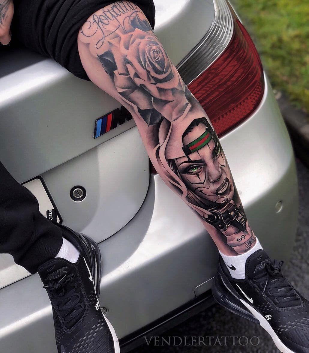 Кроме татуировки во всю длину руки, мужчины набивают брутальный лик Джокера на запястье. Не исключен также вариант четверти рукава – рисунок начинается от плеча, но заканчивается перед локтем. С целью достижения красочности изображения татуировщики используют приемы реализма и нео-традишинал, а также стилей нью и олд скул. Для детальной проработки монохромных образов профессионалы пользуются стилем чикано.