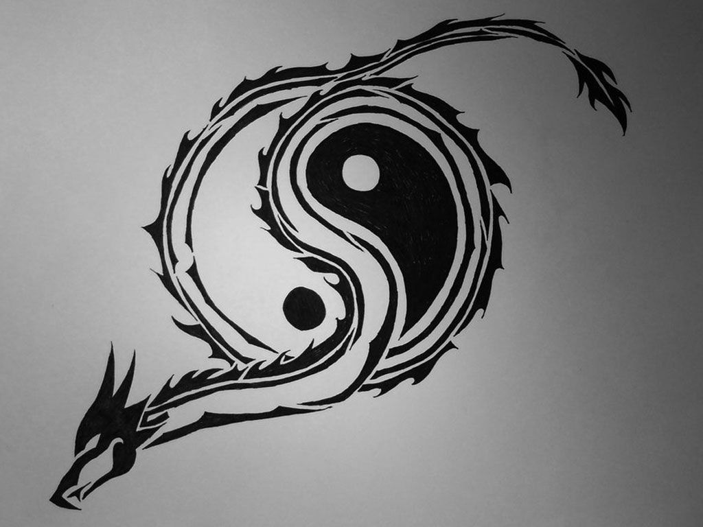 - Инь-янь с драконом – сила, внутренняя гармония и мудрость. Варианты эскизов – зверь держит символ в лапах или же обвивает его. Демонстрируя противоположности, дракона набивают совместно с тигром.