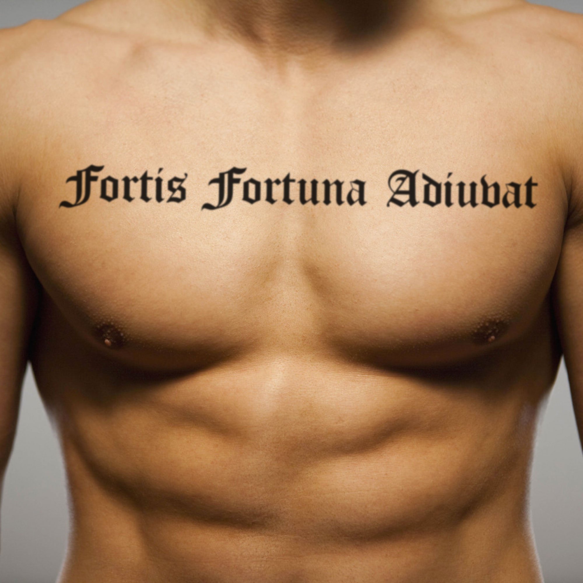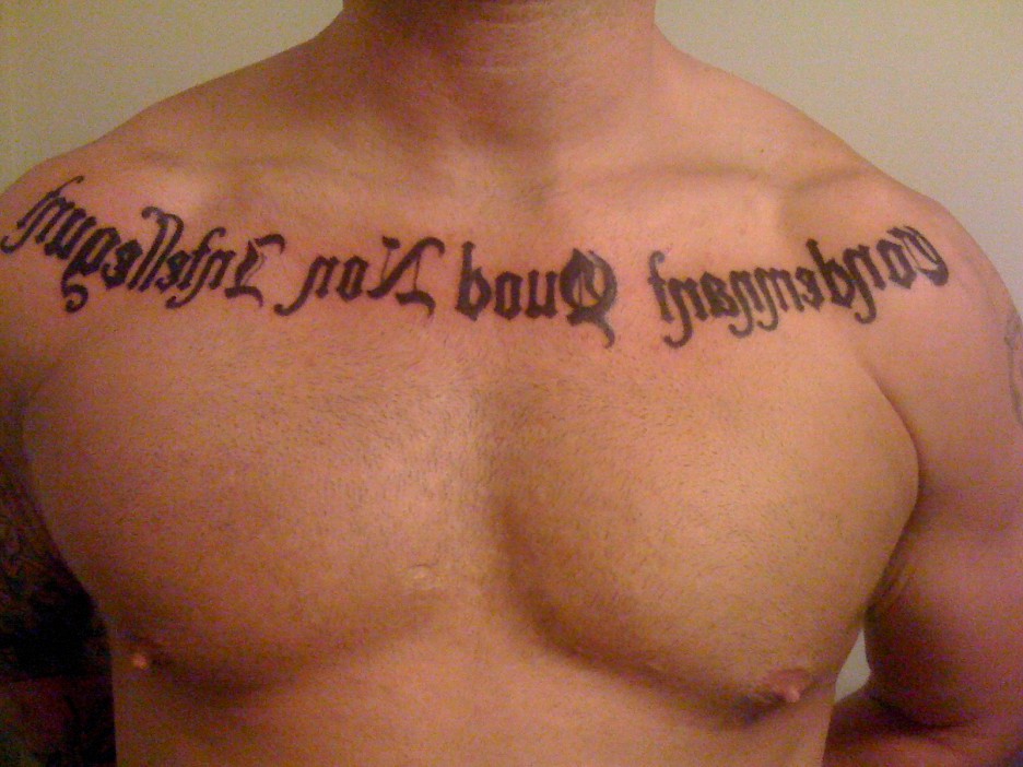 На груди татуировки должны подразумевать сугубо личный характер. Сюда можно нанести фразы, что сделают мужчины везунчиком, повернуть Фортуну к нему лицом, уберегут от тьмы и зла.