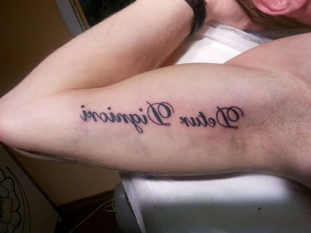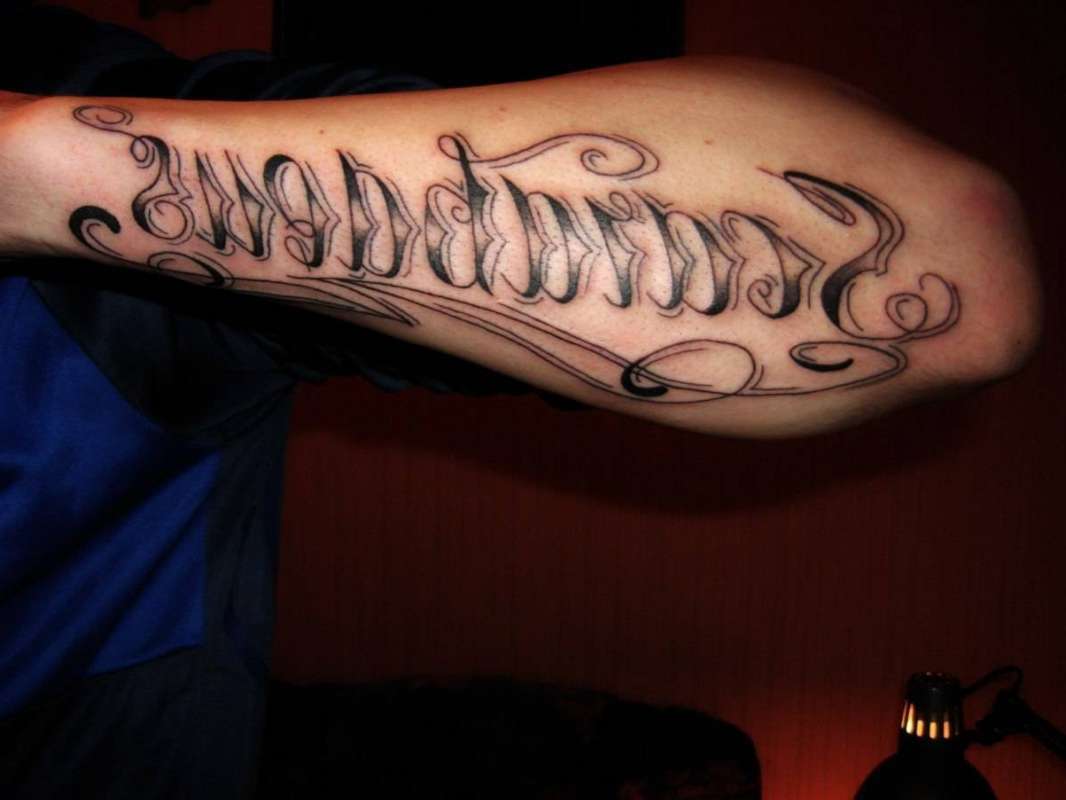 · Мужским считается способ выделиться, набив тату надпись на предплечье, такие фразы «Cum deo» («с богом») или «Audaces fortuna juvat» («Счастье сопутствует смелым») или надпись «Каждому свое» характеризует сильную, независимую натуру.