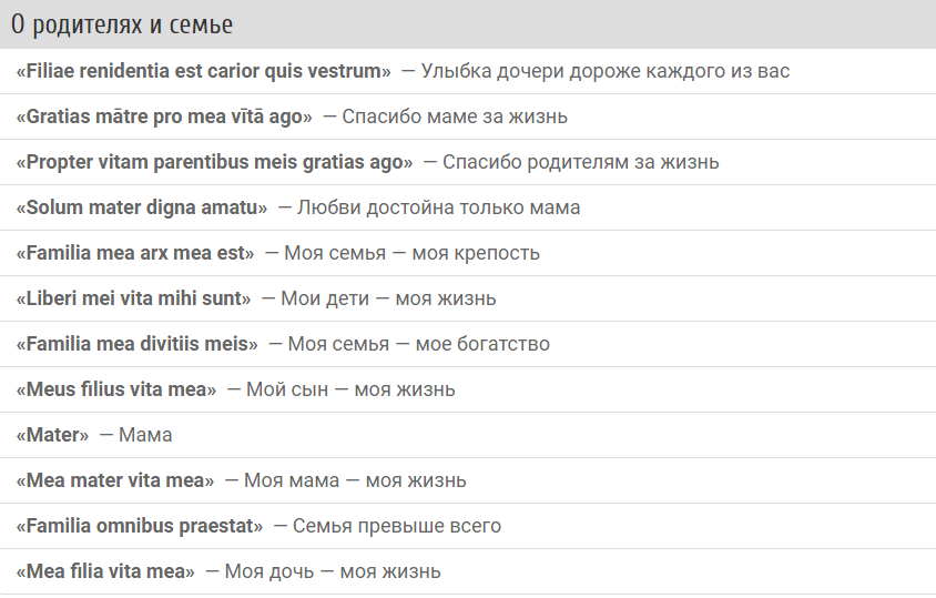 У многих людей в жизненный приоритет – это любовь и семья. Можно на латинском запечатлеть на теле имена родных (детей, супруга), свадебные клятвы и красивые афоризмы. Среди них наиболее популярны: