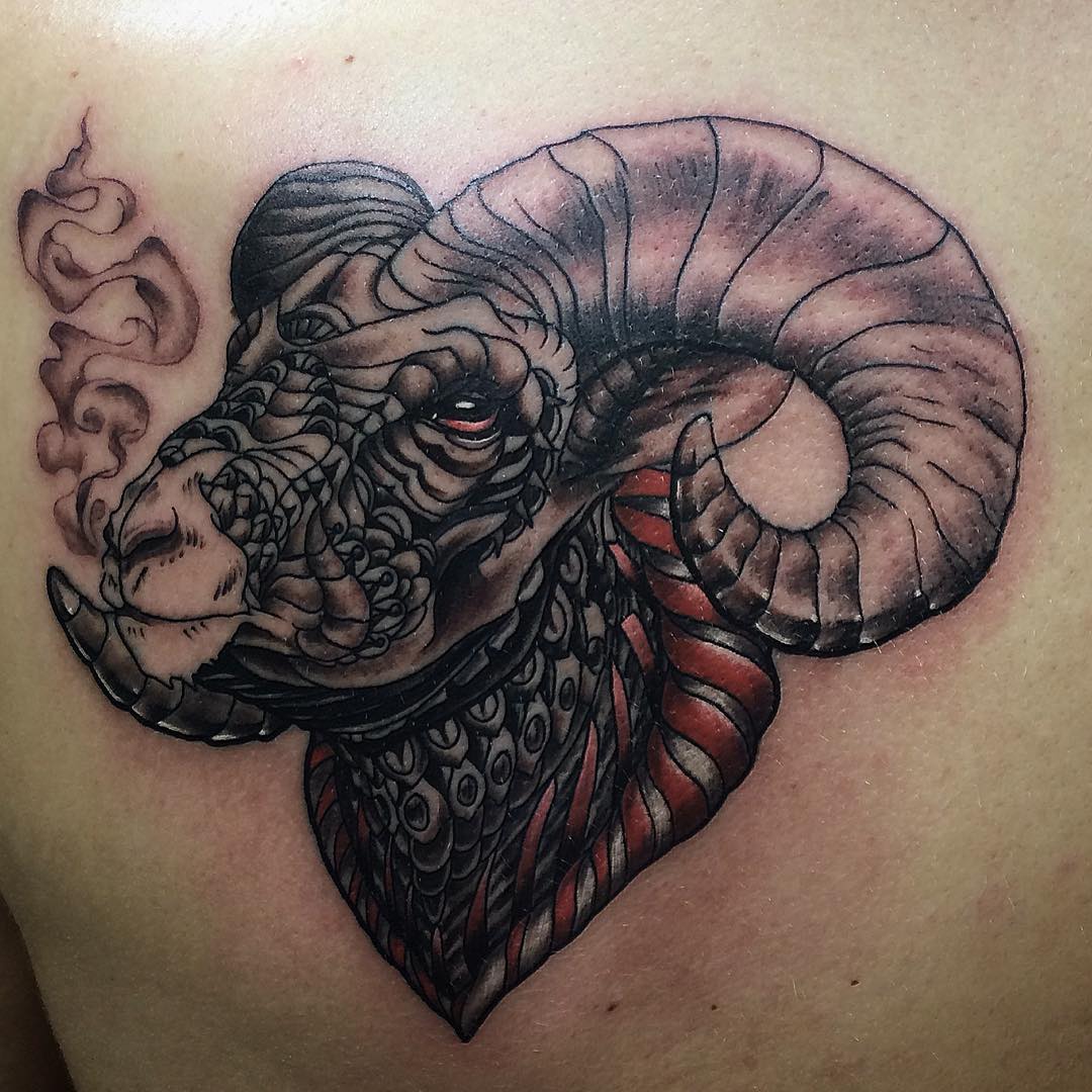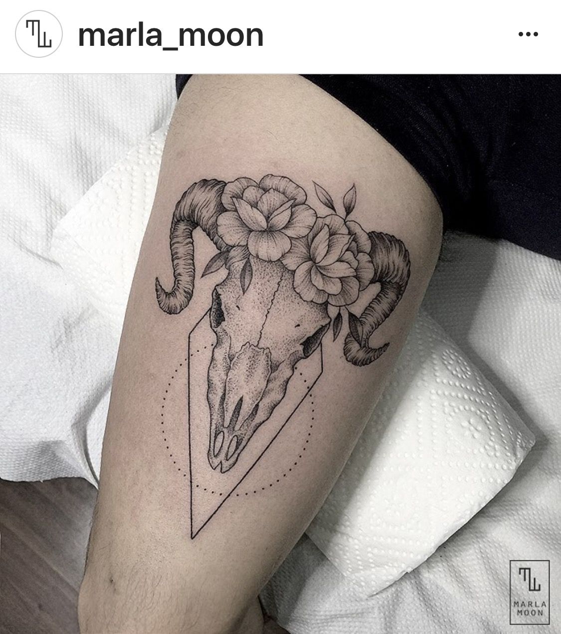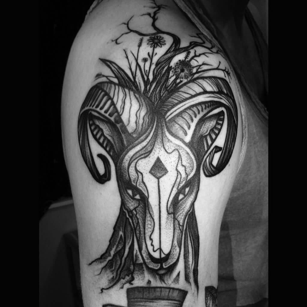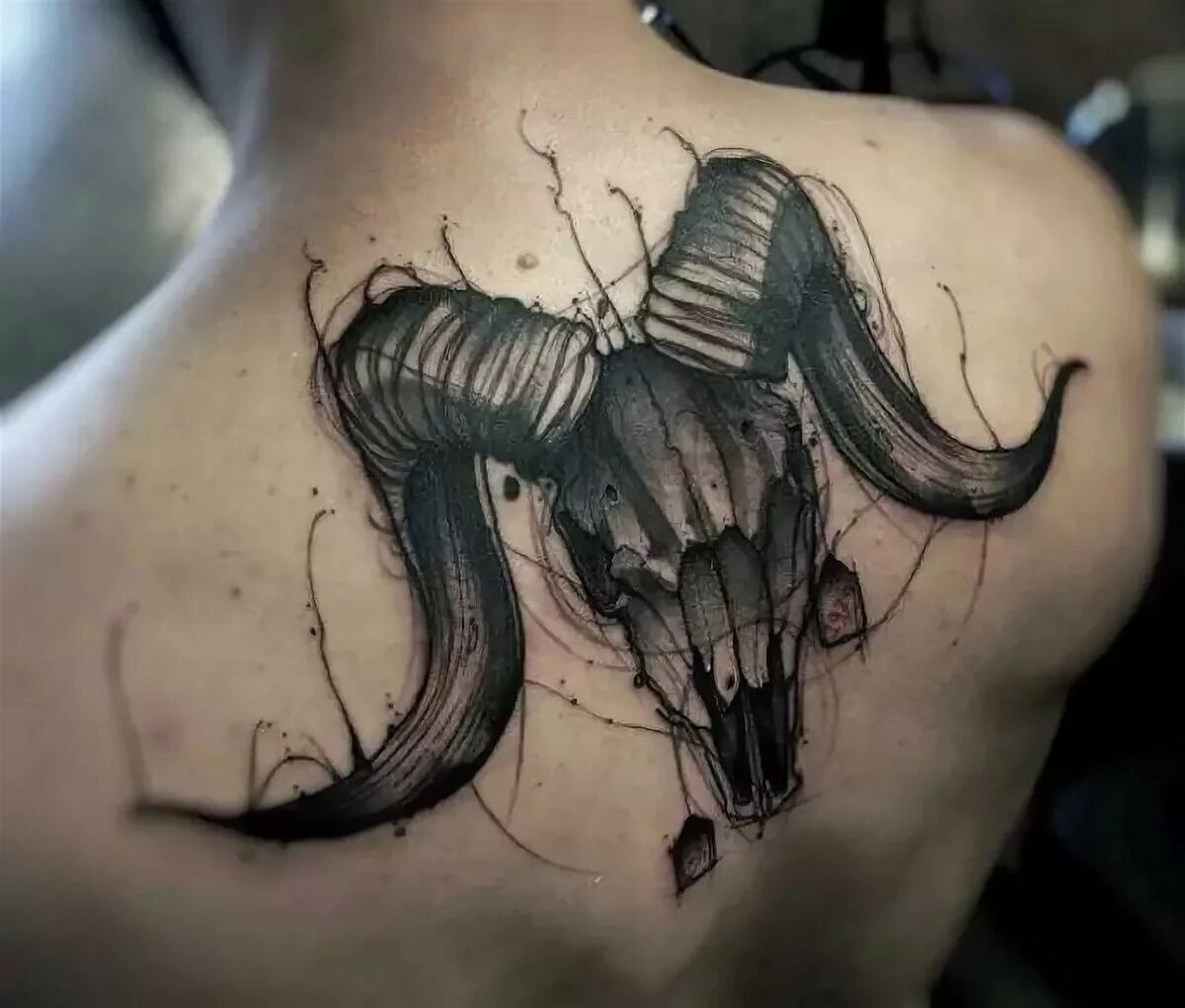 Подчеркнуть брутальность, бесстрашие, и внести сакральный смысл в татуировку можно изобразив череп барана.