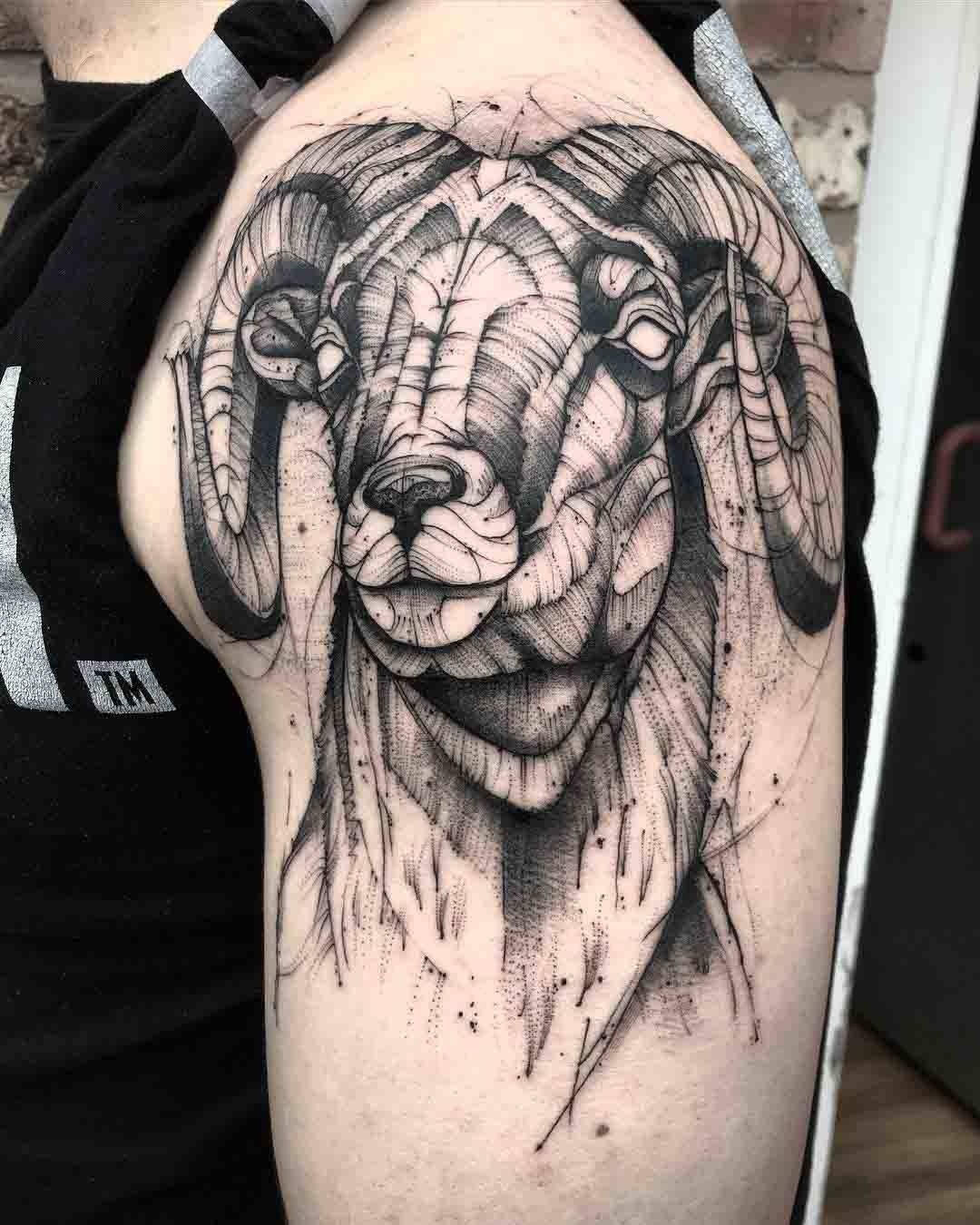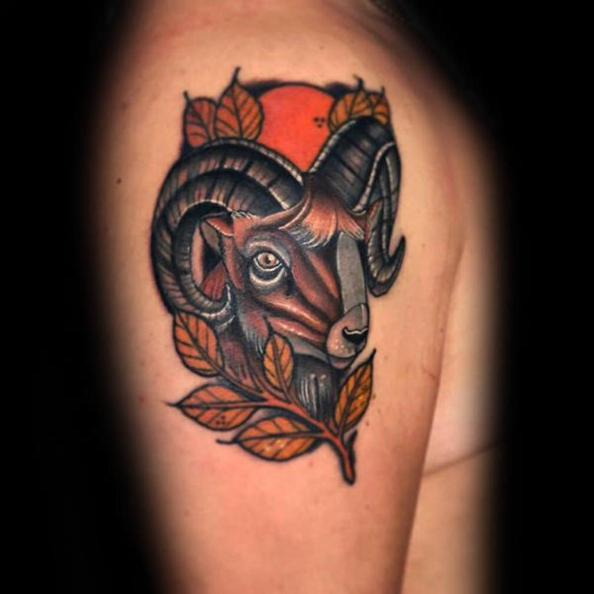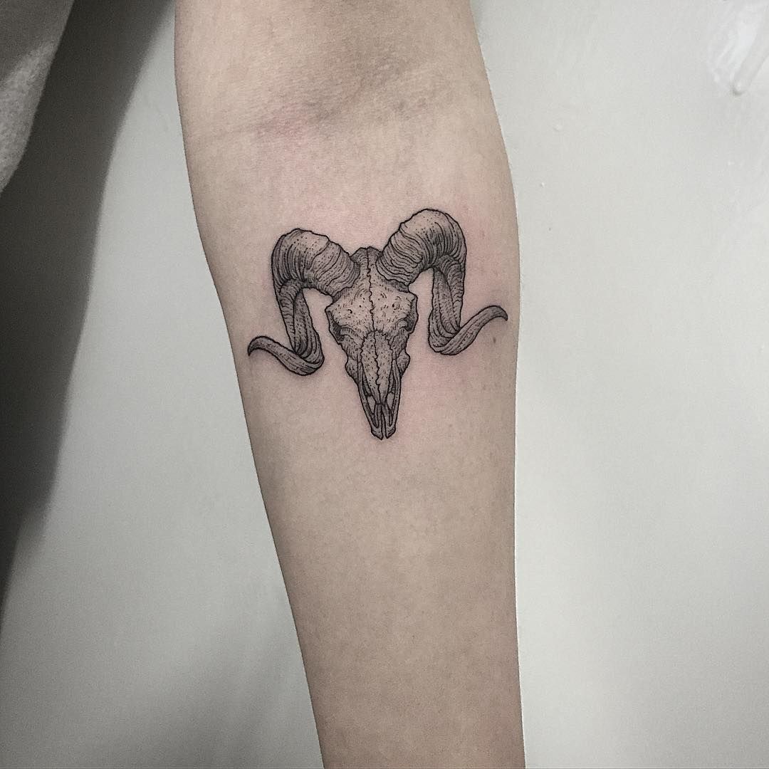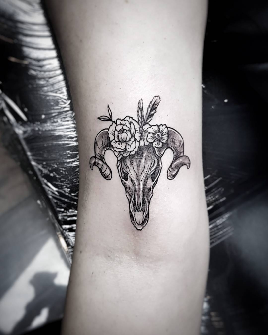 Подчеркнуть брутальность, бесстрашие, и внести сакральный смысл в татуировку можно изобразив череп барана.