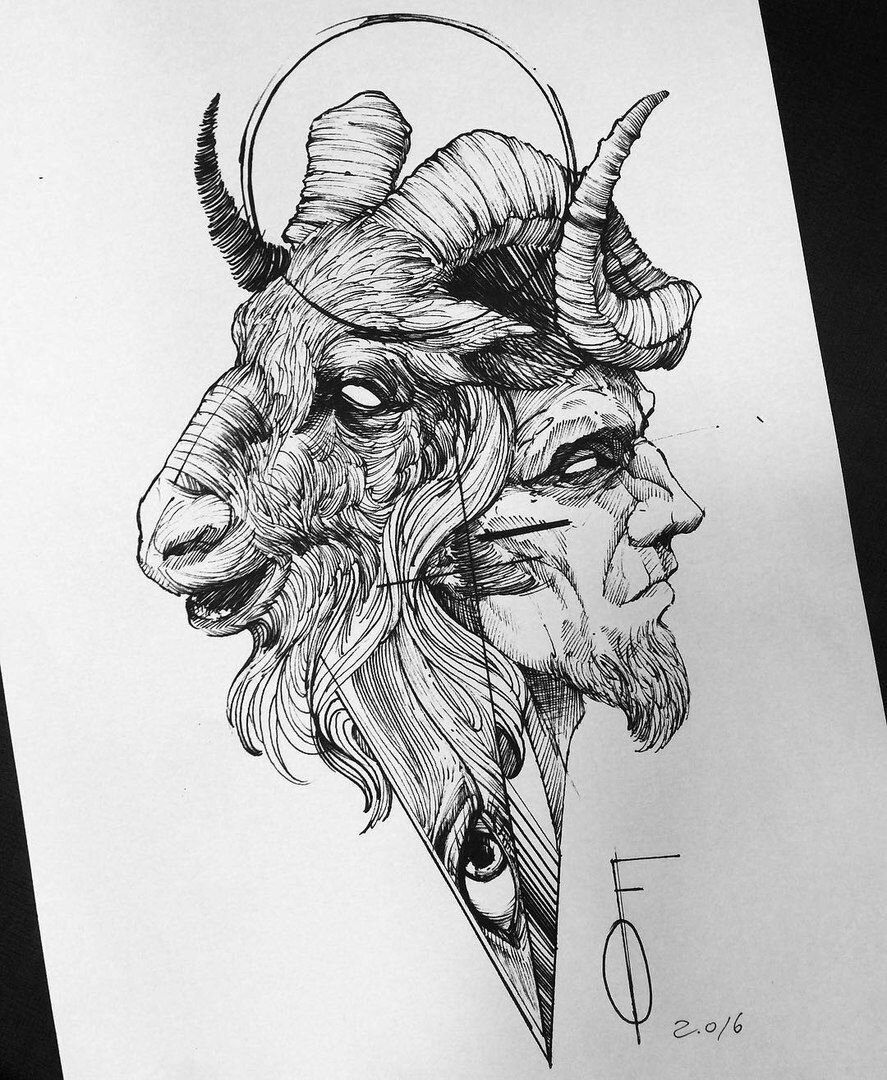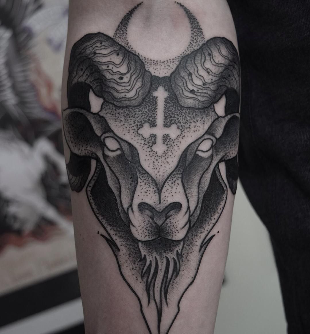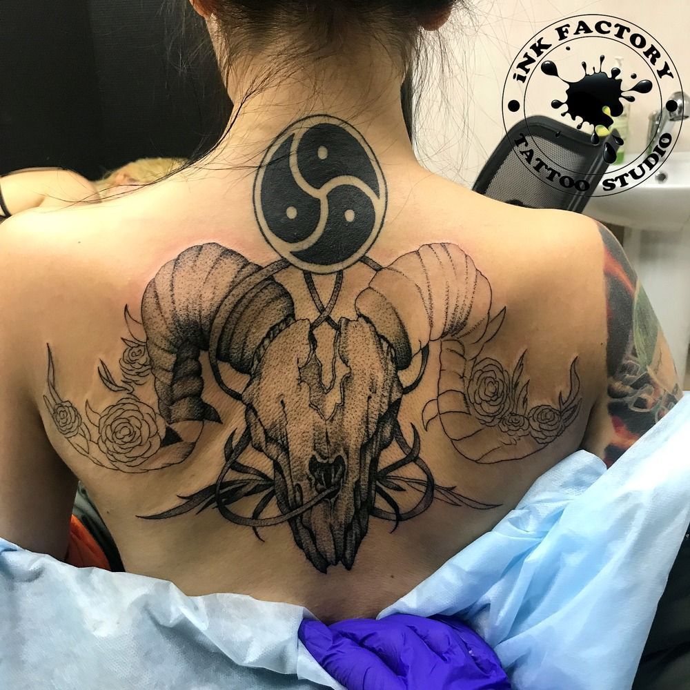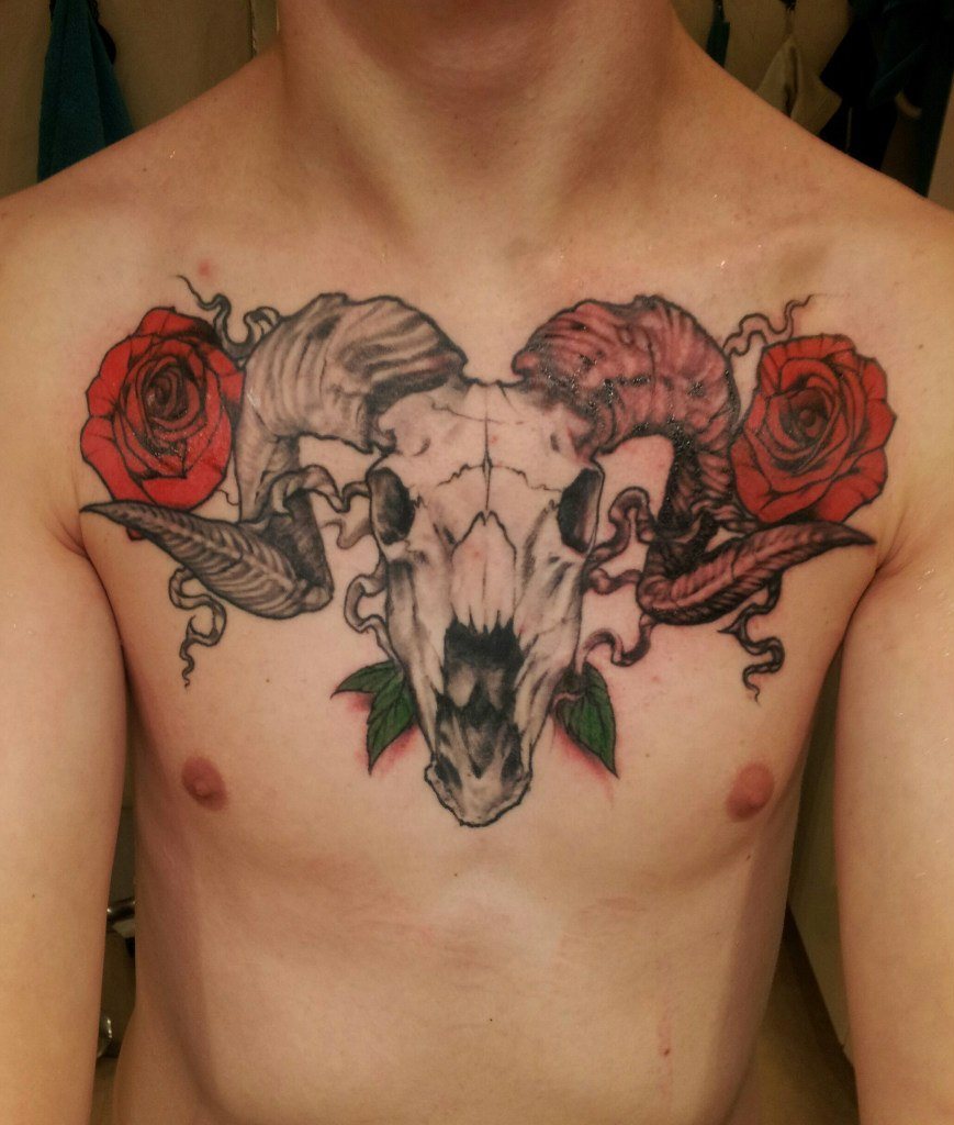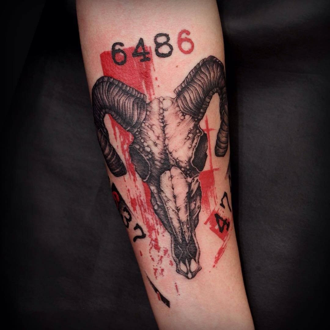 Подчеркнуть брутальность, бесстрашие, и внести сакральный смысл в татуировку можно изобразив череп барана.