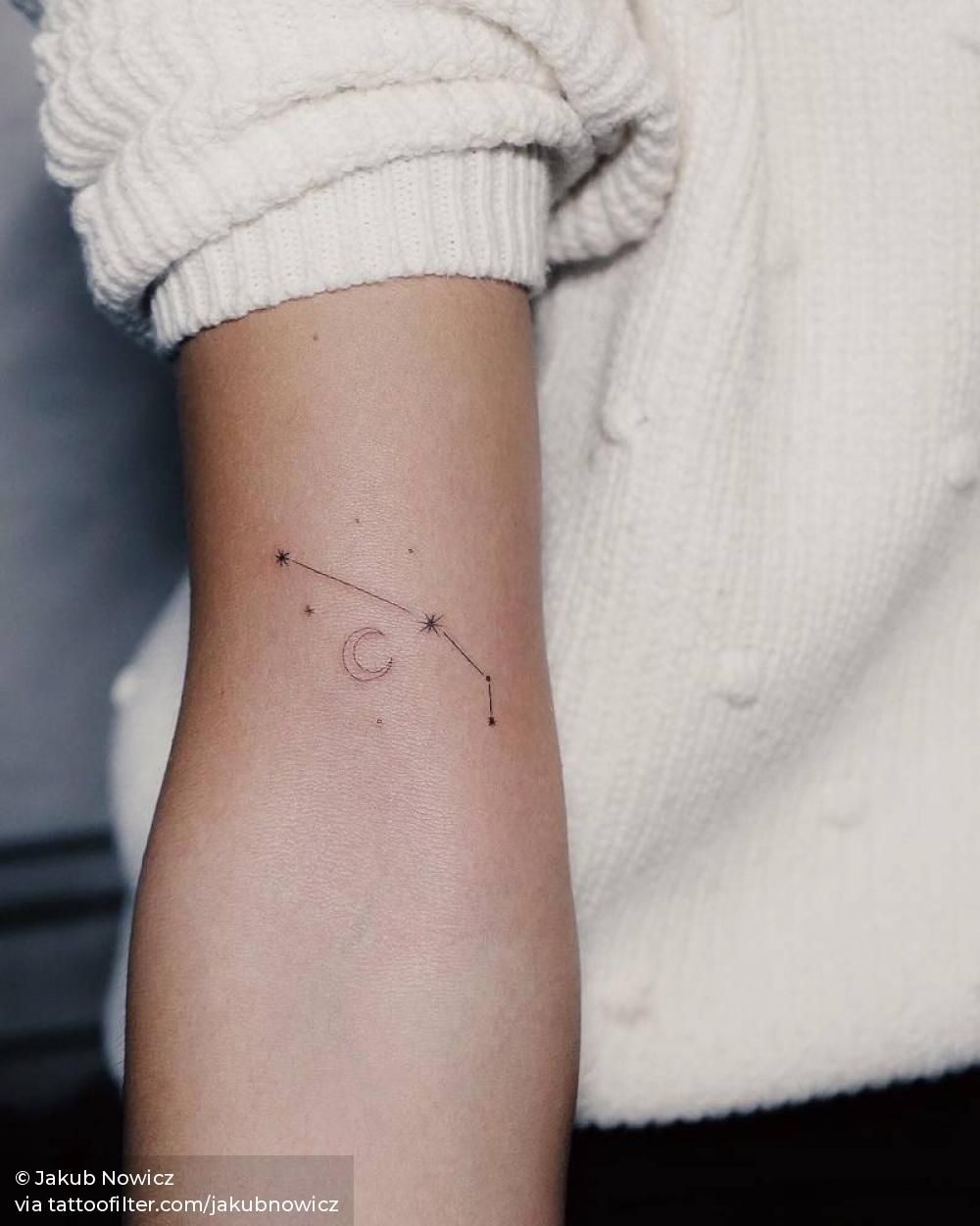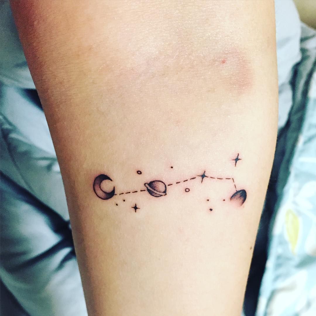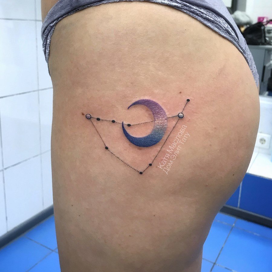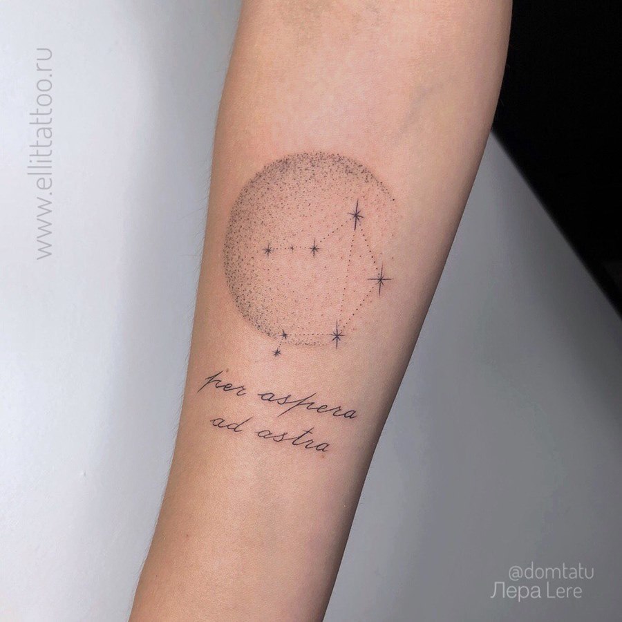 Для тех девушек, которые не хотят располагать на своем теле крупные тату, отличным решением станут эскизы с созвездием. Созвездие Овна включает в себя три основные звезды. На эскизе они обычно соединяются линией и дополняются такими изображениями как горы, млечный путь и т.д. Татуировка с созвездием красиво смотрится на запястьях, на ключице, на руке выше локтя.