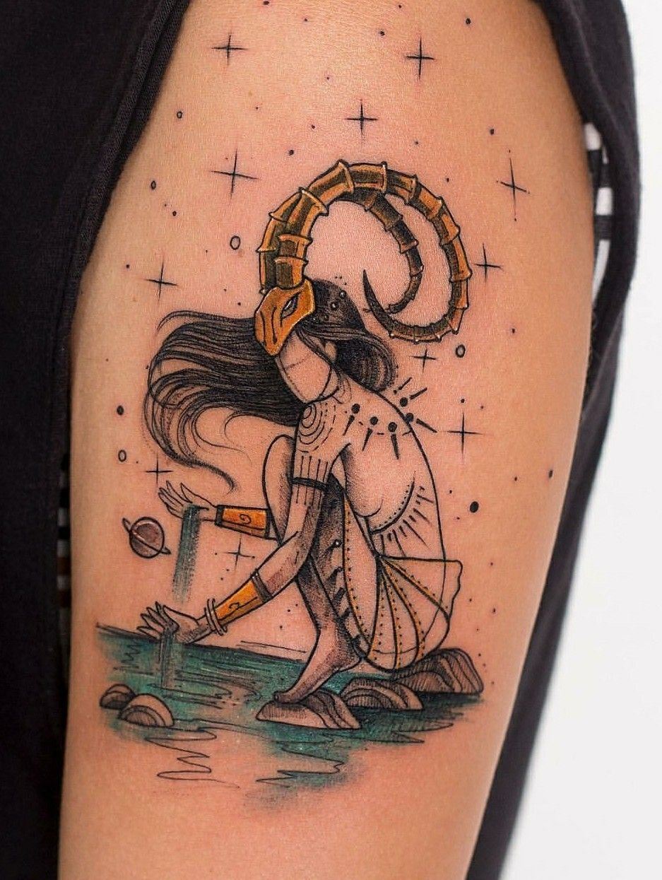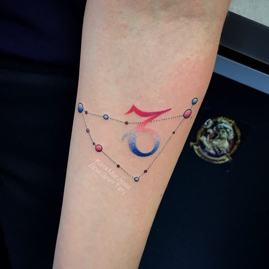 Девушки чаще всего останавливают свой выбор на символических изображениях. Это раздвоенная фигура, напоминающая рога. В данном варианте символ можно трактовать как взрыв, благодаря которому образовалась материя. Таким образом татуировка будет не только персонифицировать Вас, как человека рожденного в определенный период, но и приобретет глубокий смысл.