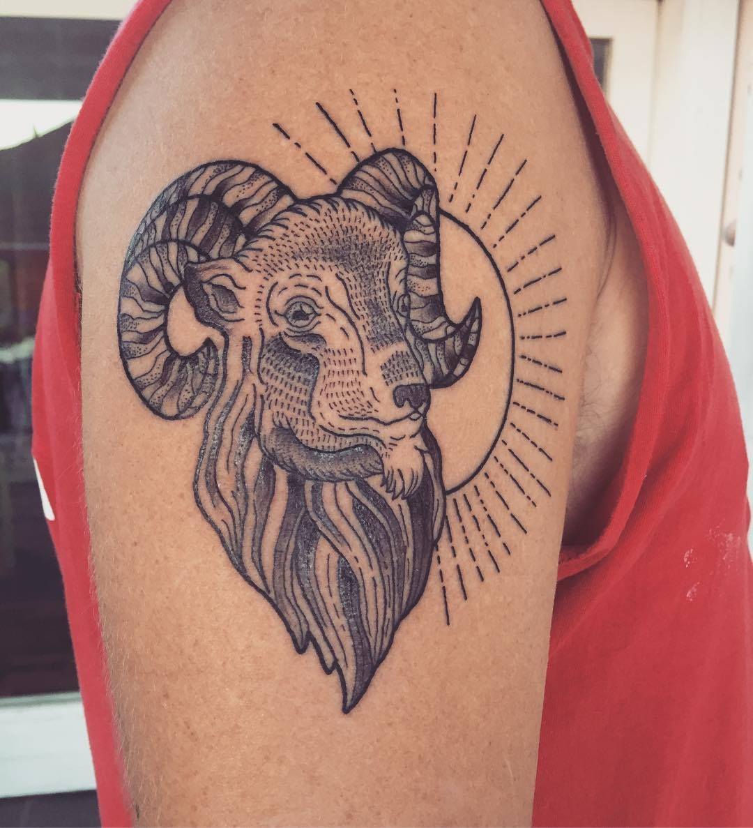 Изображение Овна красиво смотрится как в одиночном изображении, так и совместно с дополнительными символами. Тату Овен стильно смотрится с узорами мехенди, с точечными узорами и символами, с геометрическими формами. Для надписи можно использовать разные шрифты, наиболее востребованный из которых готический.