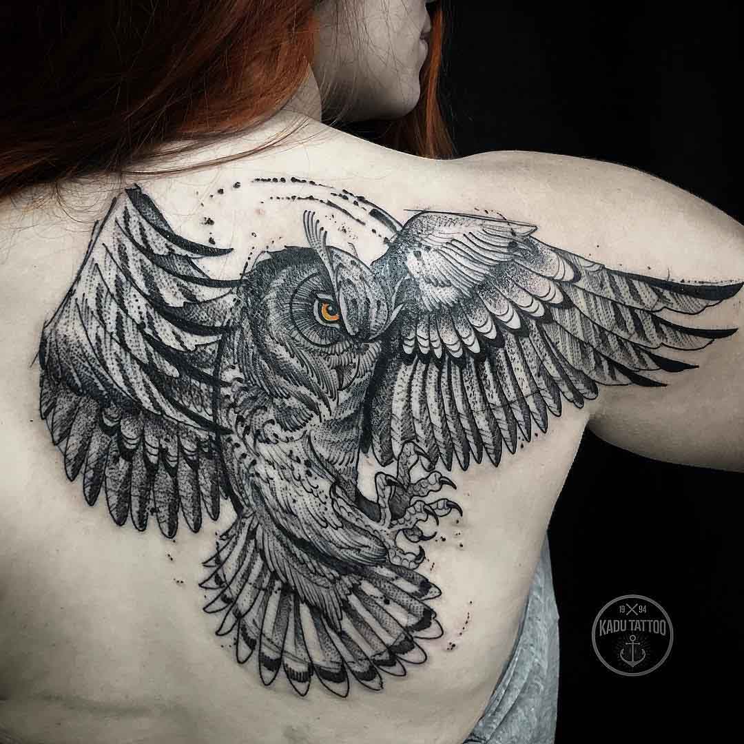 Загадочная сова говорит не только о врожденной мудрости женщины, но и несет мистический смысл, нотки таинственности, которая кроется за дверьми души хозяйки.