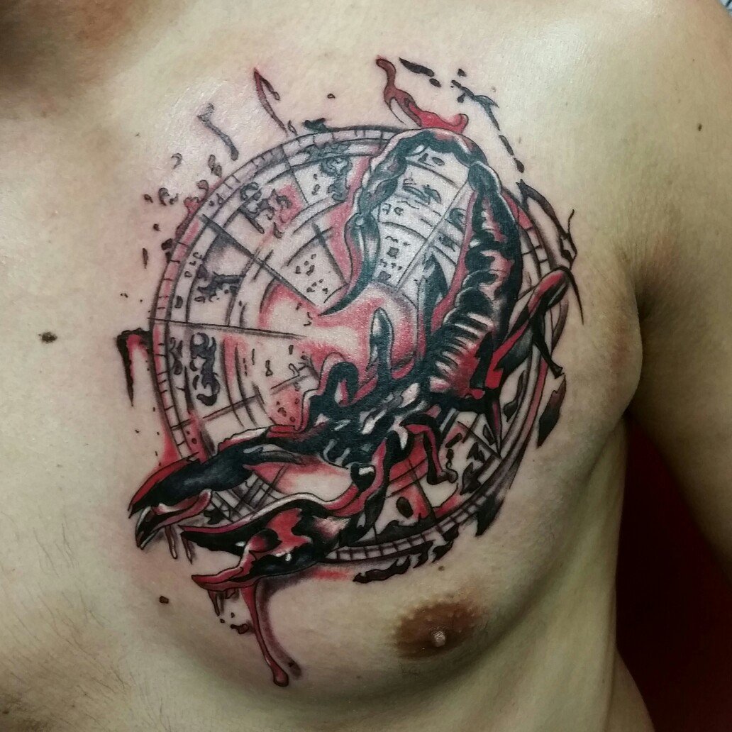 Если же вы желаете, чтобы окружающие как можно меньше внимания обращали на вашу татуировку, постарайтесь нанести ее на закрытые участки тела. Тату скорпион на груди будет прекрасно выглядеть, причем независимо от пола обладателя татуировки.