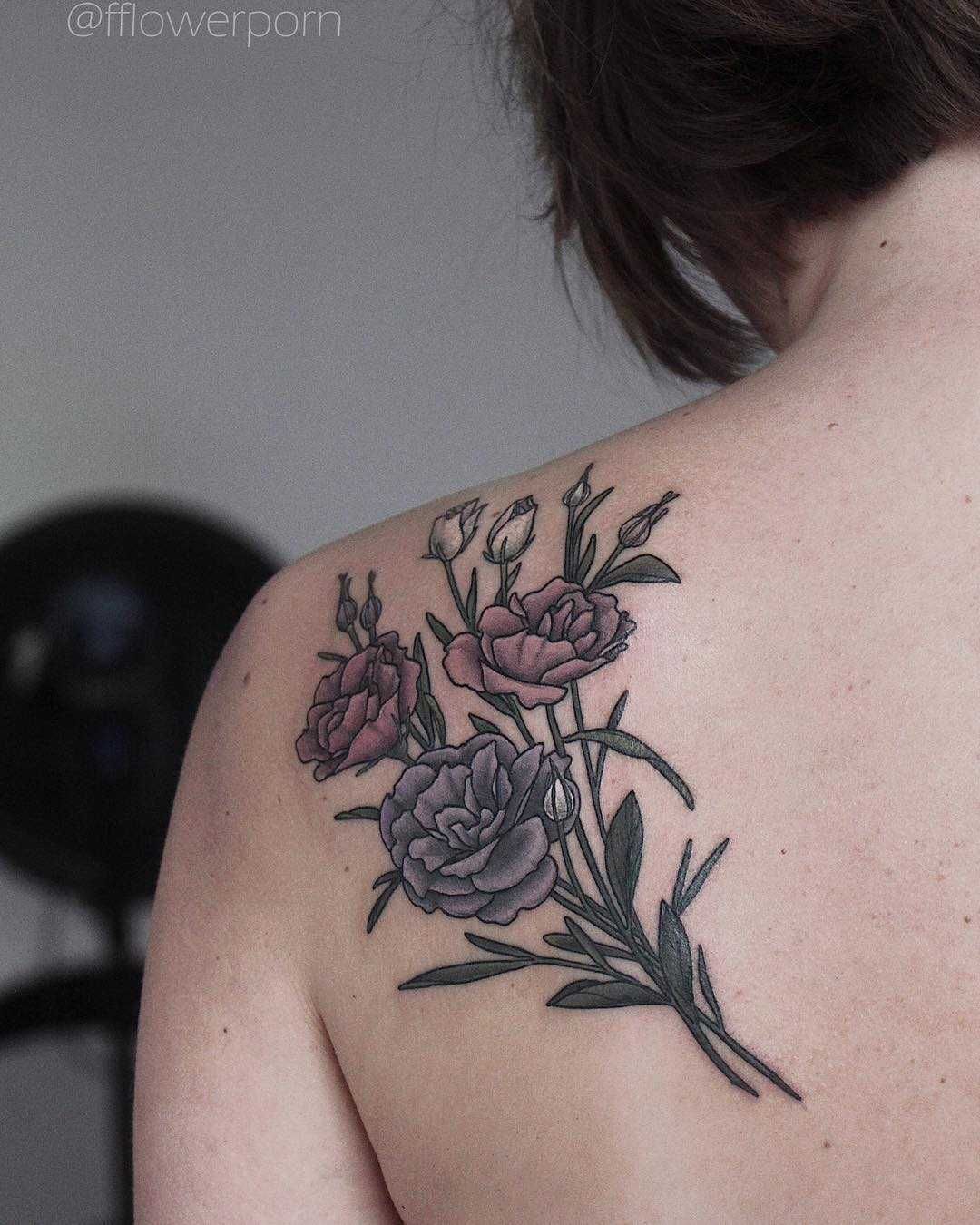Императорский пион на лопатке девушки смотрится шикарно. Этот счастливый знак древние люди наносили для привлечения удачи, богатства в дом.