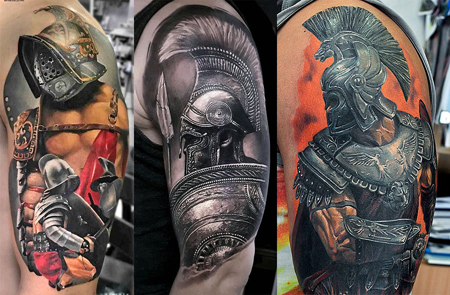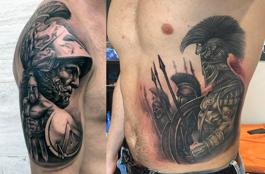 У парней, чаще всего, можно увидеть тату гладиатора на плече. Эта зона идеально подходит для изображения портрета, бюста, или даже целой фигуры в шлеме, полной амуниции и т.д. Это могут быть упомянутый Спартак, Максимус из голливудского блокбастера, либо какой-то нейтральный персонаж.
