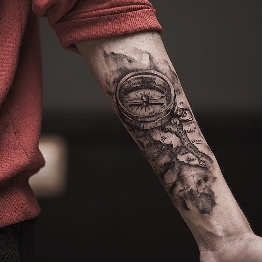 Намного реже можно увидеть на предплечье изображение компаса, которое может иметь глубокий смысл. Есть мнение, что компас способствует нахождению верного жизненного пути. К тому же такое тату может означать равновесие, верность и постоянство человека, на предплечье которого оно нанесено.
