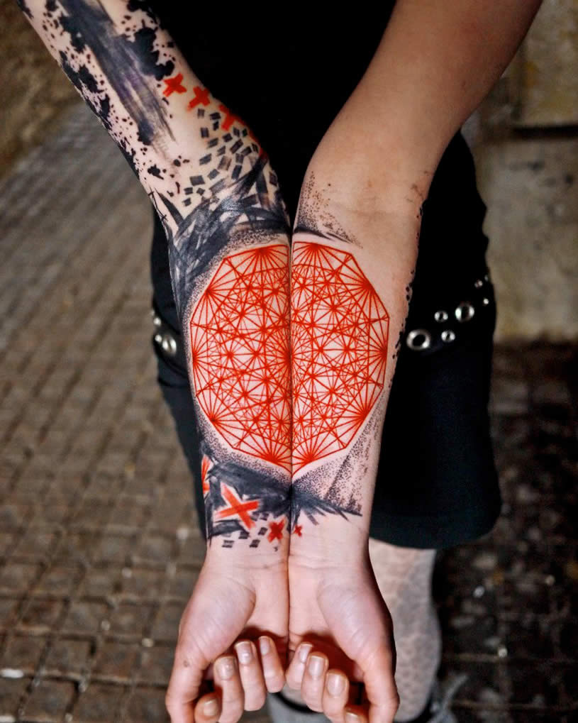 Геометрия – точные линии. Один неверный штрих нарушит всю целостность картины. Из существующих геометрических фигур тату-мастер может создать фантастическую историю. Это может быть как животное, так и орнамент. Цвет-черный. Насыщенность влияет на объёмность. Другие цвета приветствуются.